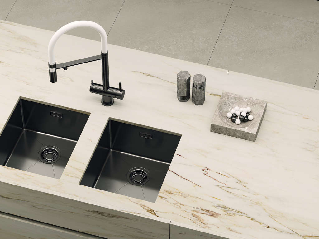 вровень со столешницей — создается ощущение бесшовного пространства, а если мойка сделана из того же материала, то и единого дизайна;