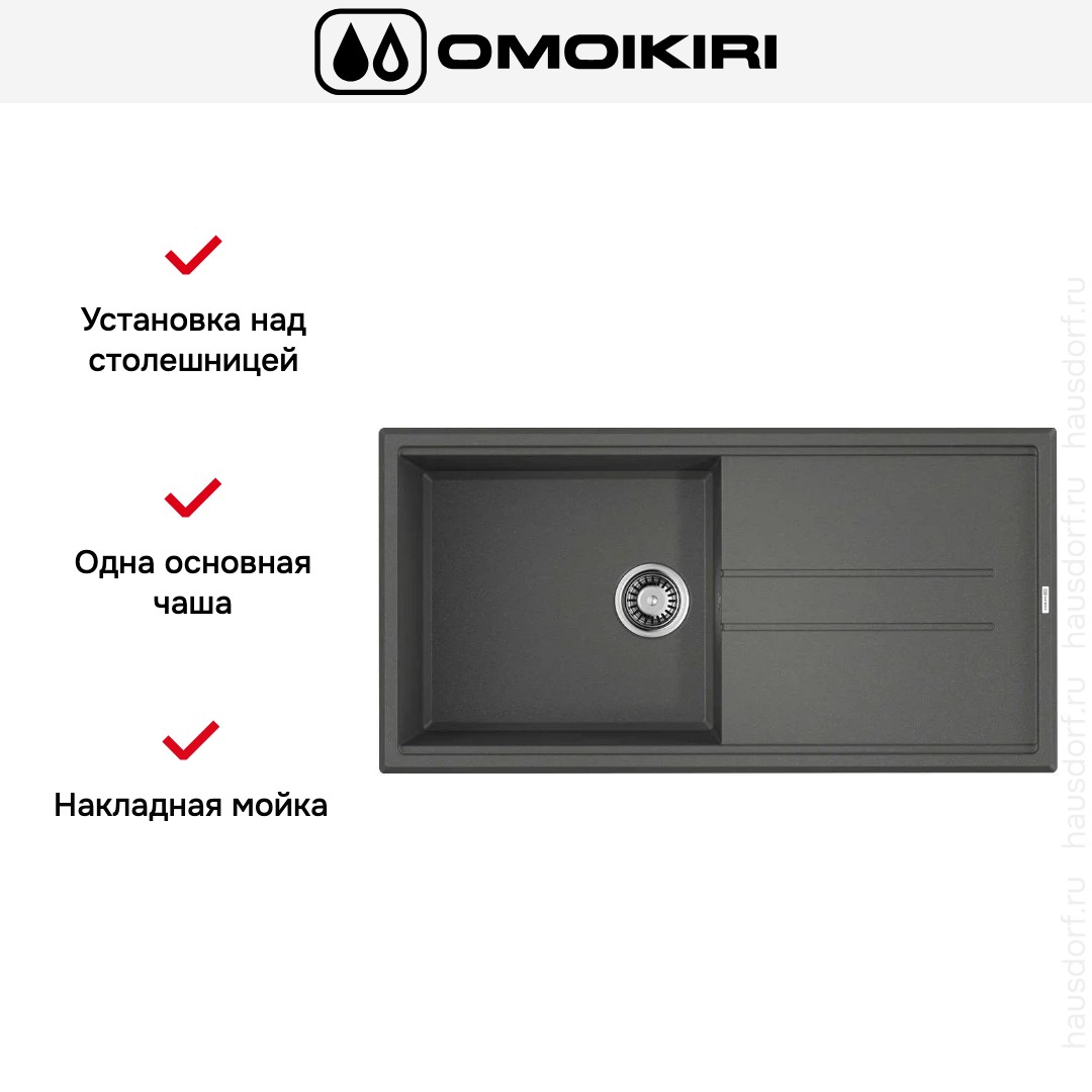 Накладная мойка Omoikiri — отличный выбор для тех, кто хочет создать гармоничное пространство с удобной сантехникой. простой в установке. Преимущество такой конструкции: легко подобрать практически к любой кухне и не придется демонтировать вместе с тумбой при ремонте или перестановке остальной мебели. Данная модель имеет стандартную форму, поэтому подходит большинству пользователей. Устанавливается над столешницей: это самый простой способ монтажа, зачастую с ним можно справиться даже без специалистов, главное — правильно рассчитать размеры ниши.
