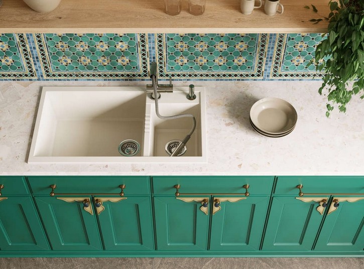 вровень со столешницей — создается ощущение бесшовного пространства, а если мойка сделана из того же материала, то и единого дизайна;