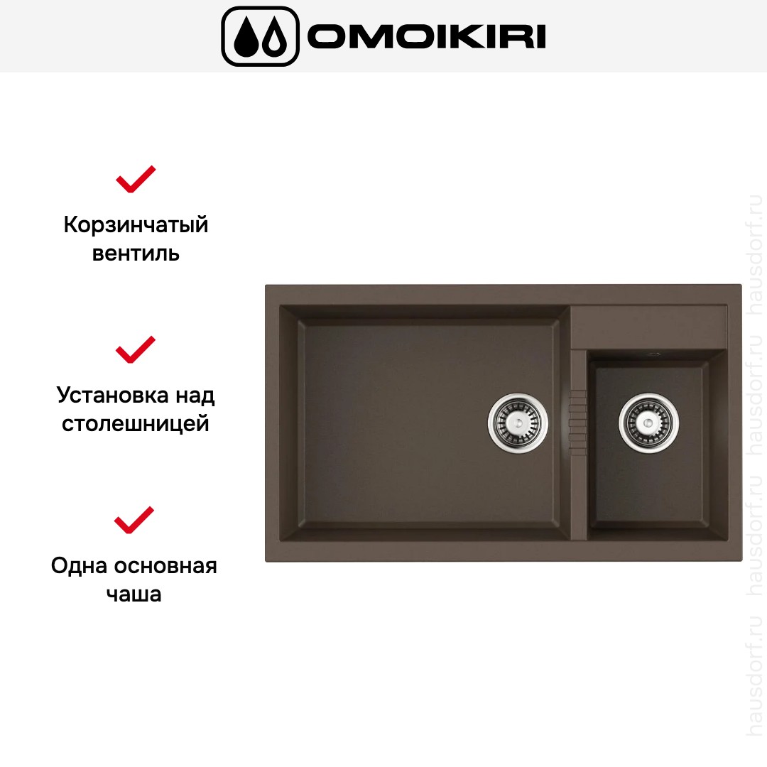 Накладная мойка Omoikiri — отличный выбор для тех, кто хочет создать гармоничное пространство с удобной сантехникой. простой в установке. Преимущество такой конструкции: легко подобрать практически к любой кухне и не придется демонтировать вместе с тумбой при ремонте или перестановке остальной мебели. Данная модель имеет стандартную форму, поэтому подходит большинству пользователей. Устанавливается над столешницей: это самый простой способ монтажа, зачастую с ним можно справиться даже без специалистов, главное — правильно рассчитать размеры ниши.