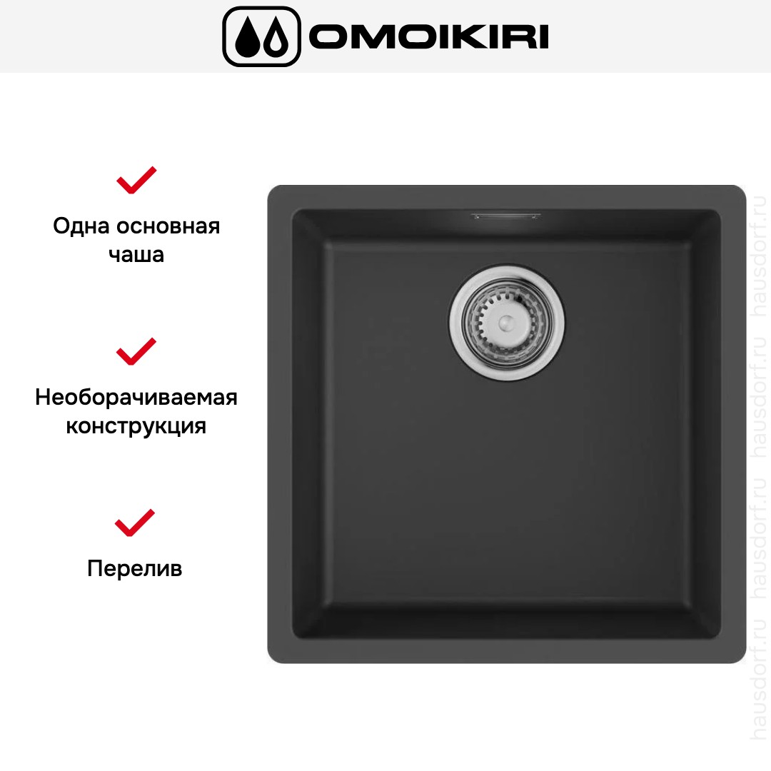 Выглядит компактно и сдержанно: квадратный контур размером 45.6×45.6 см формирует ровную, строгую геометрию. Черного цвета поверхность делает мойку заметным, но благородным акцентом на кухне. Углы продуманы с точки зрения практичности, а общие габариты позволяют установить модель даже в ограниченном модуле.