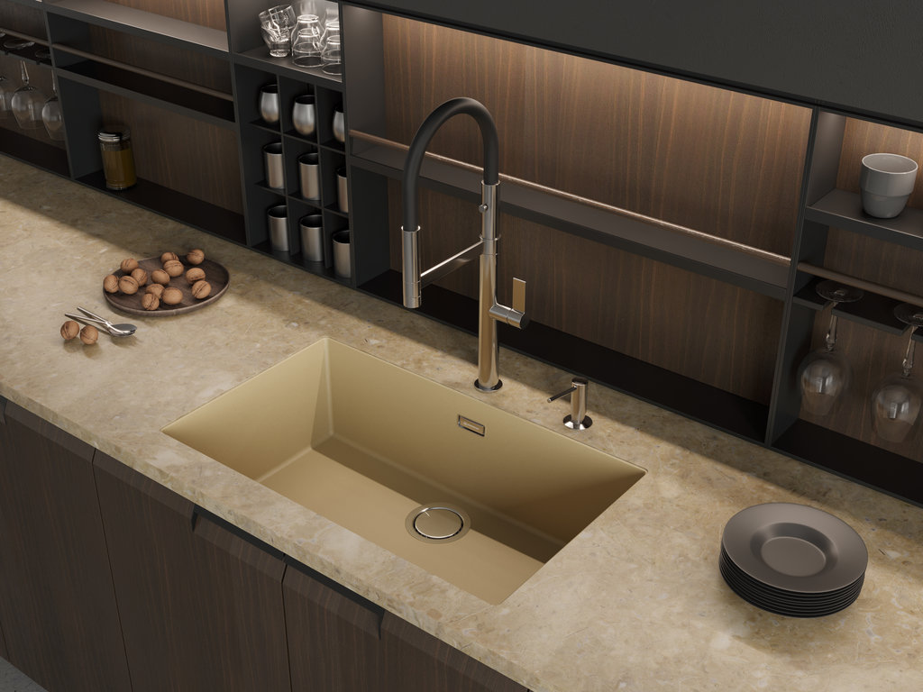 под столешницу — мойка расположена чуть ниже рабочей поверхности для лучшей герметизации;