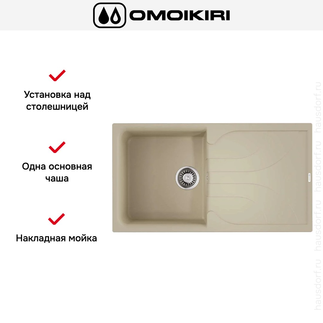 Накладная мойка Omoikiri — отличный выбор для тех, кто хочет создать гармоничное пространство с удобной сантехникой. простой в установке. Преимущество такой конструкции: легко подобрать практически к любой кухне и не придется демонтировать вместе с тумбой при ремонте или перестановке остальной мебели. Данная модель имеет стандартную форму, поэтому подходит большинству пользователей. Устанавливается над столешницей: это самый простой способ монтажа, зачастую с ним можно справиться даже без специалистов, главное — правильно рассчитать размеры ниши.