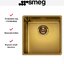 Мойка Smeg VSTR40BRX — врезная модель квадратной формы со скругленными углами, ее ширина и глубина составляют 44 см. Предназначена для установки под столешницу и может монтироваться в тумбу шириной 60 см. Имеет одну чашу со сливным отверстием в задней части и является необорачиваемой, то есть может устанавливаться только в одном положении. Мойка Смег VSTR40BRX с оригинальным экологичным покрытием цвета латуни изготовлена из матовой нержавеющей стали AISI304 толщиной 1 мм.