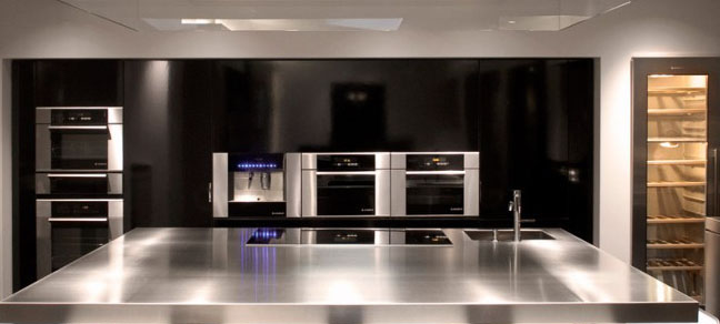 Передняя панель изготовлена из черного стекла с алюминиевыми профилями и рамкой из нержавеющей стали, что соответствует самым модным тенденциям в оформлении кухонного интерьера.