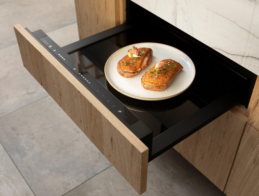 Подогреватель открывается нажатием на фронтальную панель — ящик выезжает на несколько сантиметров, полностью открыть камеру можно, потянув его до упора. Такой способ распространен в современной технике, благодаря этому вы можете собрать комплект из кухонных приборов без выпирающих ручек и создать «бесшовный» интерьер.