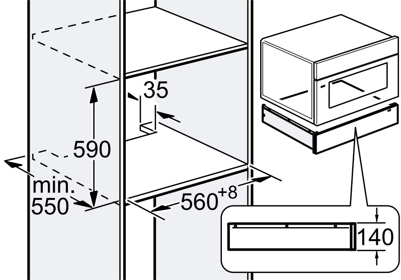 Высота встраиваемых подогревателей посуды определяется прежде всего тем, что обычно они устанавливаются в колонну с другой бытовой техникой. Подогреватели часто размещают под кофемашинами, микроволновками и другими подобными приборами, высота которых составляет около 45 см. Стандартная высота подогревателя при этом составляет около 14 см, так что суммарная высота двух приборов достигает 60 см — стандартного размера кухонной ниши для встраивания. В продаже имеются также компактные подогреватели высотой от 6 см и большие модели высотой до 30 см — например, производства Miele и Gaggenau.