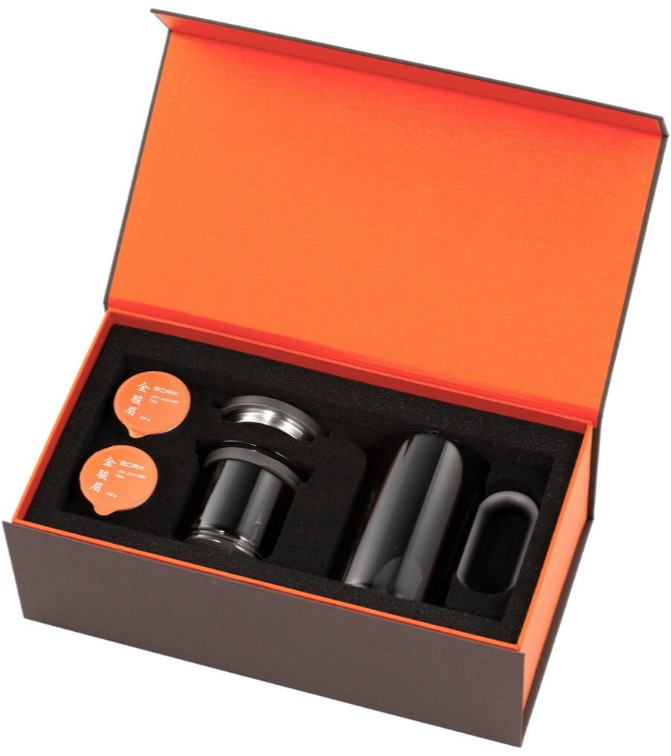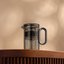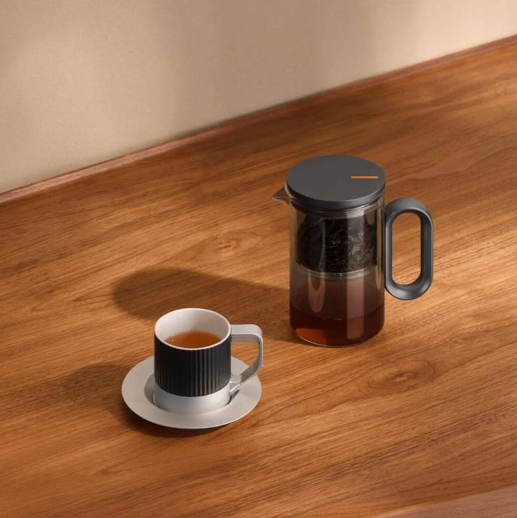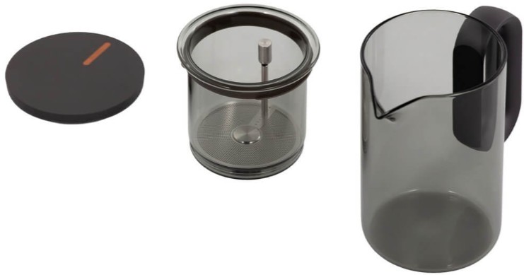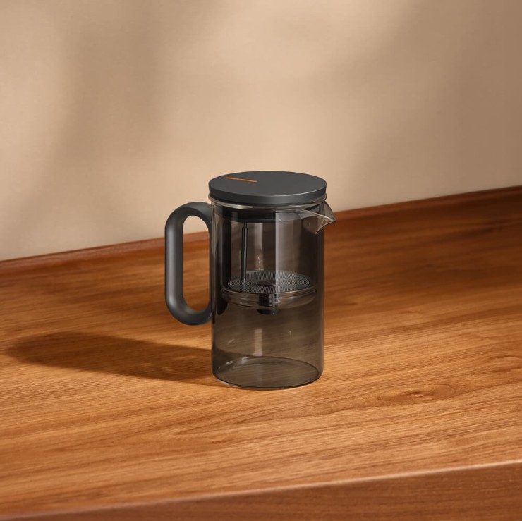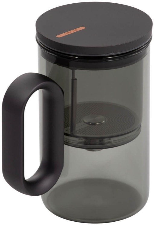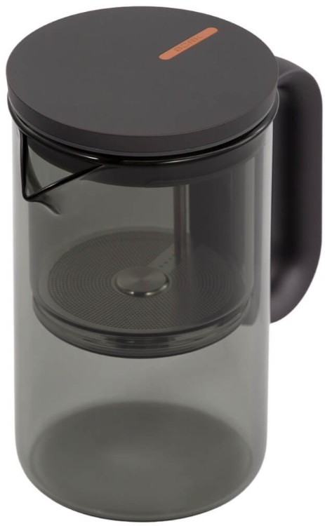 Компактный заварочный чайник в корпусе из черного стекла. Магнитный механизм позволяет перелить напиток в отдельный резервуар чайника одним касанием.