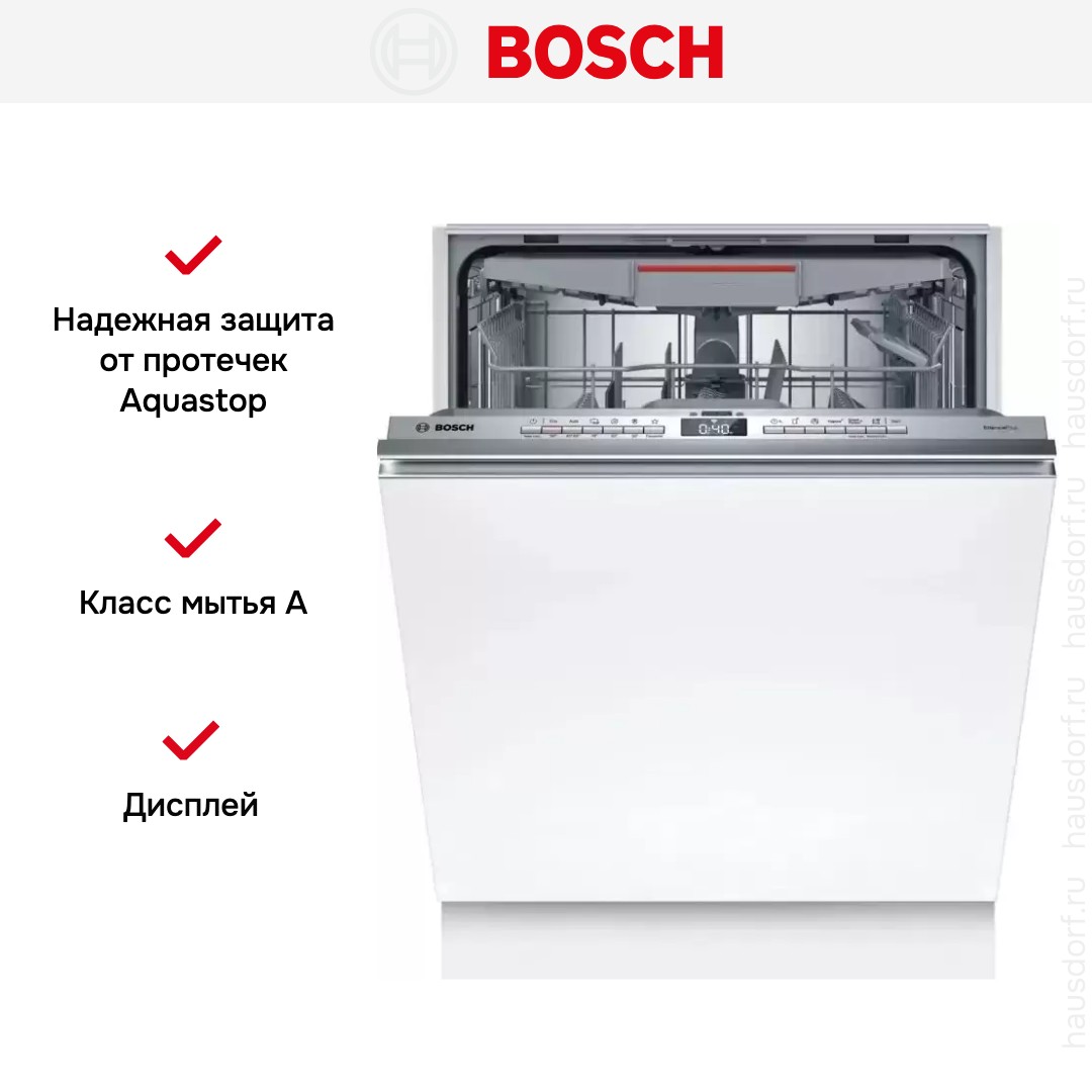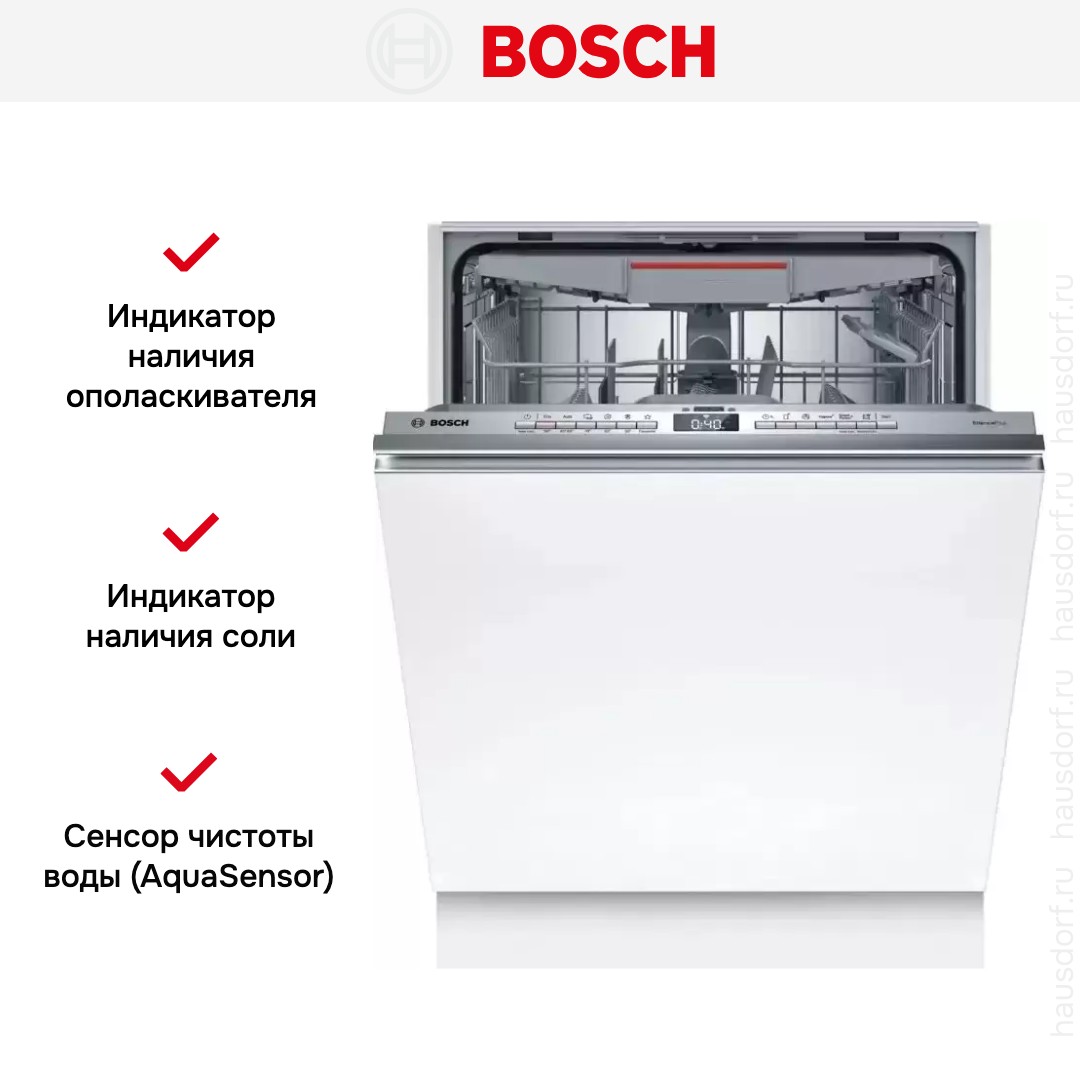 Посудомоечная машина Bosch SMV4EVX01E — встраиваемая полноразмерная модель, созданная для тех, кто ценит чистоту посуды и аккуратный интегрированный интерьер. Она полностью прячется под фасадом мебели, а видимая часть панели выполнена в серебристом тоне. Габариты 81.5×59.8×55 см и диапазон ниши 81.5—87.5×60—60.8×55 см позволяют установить прибор в любой стандартной кухонной структуре.