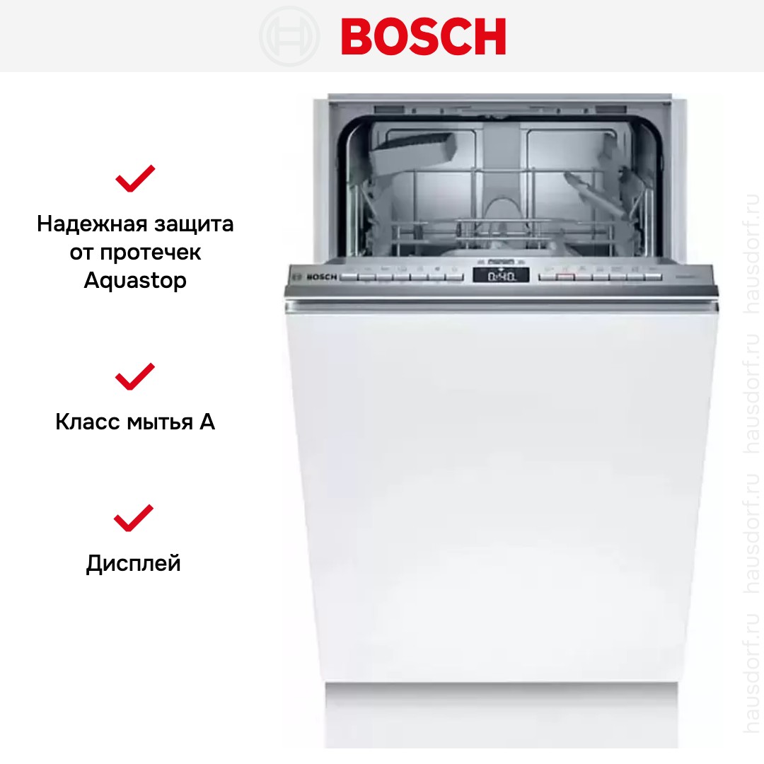 Встраиваемая модель Бош отлично впишется в любой интерьер, главное — правильно выбрать место, чтобы подвести коммуникации. Устанавливается в нишу целиком, полностью закрывается декоративной панелью. Обратите внимание: в комплекте не идет фасад, его необходимо установить самостоятельно. Имеет уменьшенную ширину — благодаря этому поместится даже на очень маленькой кухне. В камеру можно загрузить ограниченное число комплектов: 9 шт. Комплектом считается набор посуды на одного человека, который нужен для полноценного приема пищи: глубокая и плоская тарелки, тарелка для салата, блюдце под чашку, сама чашка, ложка и вилка.