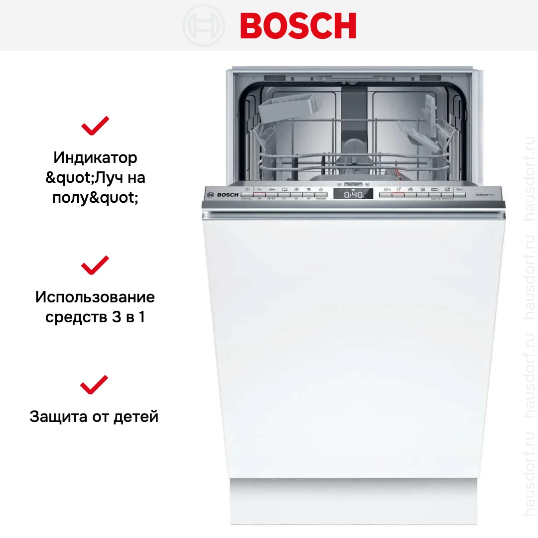Встраиваемая модель Бош отлично впишется в любой интерьер, главное — правильно выбрать место, чтобы подвести коммуникации. Устанавливается в нишу целиком, полностью закрывается декоративной панелью. Обратите внимание: в комплекте не идет фасад, его необходимо установить самостоятельно. Имеет уменьшенную ширину — благодаря этому поместится даже на очень маленькой кухне. В камеру можно загрузить ограниченное число комплектов: 10 шт. Комплектом считается набор посуды на одного человека, который нужен для полноценного приема пищи: глубокая и плоская тарелки, тарелка для салата, блюдце под чашку, сама чашка, ложка и вилка.