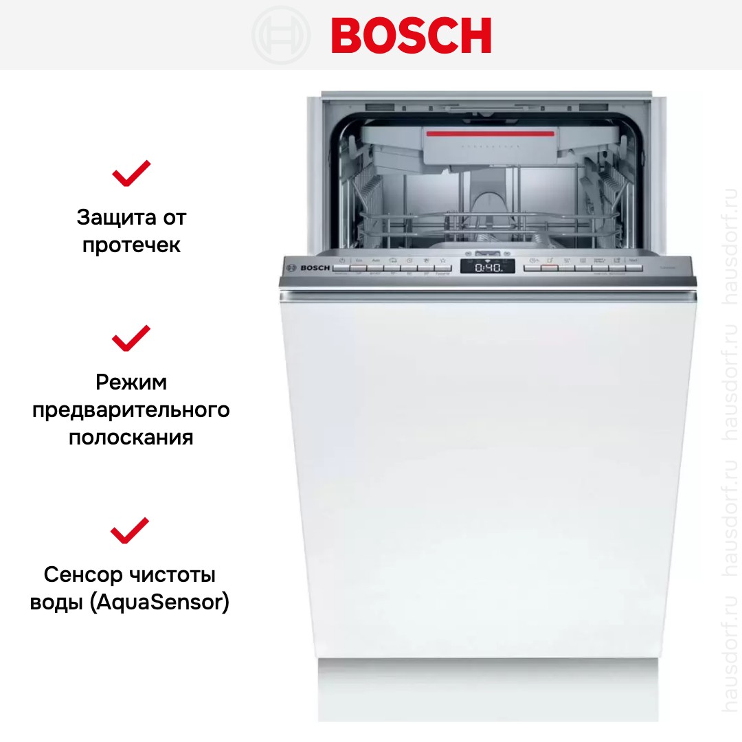Встраиваемая модель Бош отлично впишется в любой интерьер, главное — правильно выбрать место, чтобы подвести коммуникации. Устанавливается в нишу целиком, полностью закрывается декоративной панелью. Обратите внимание: в комплекте не идет фасад, его необходимо установить самостоятельно. Имеет уменьшенную ширину — благодаря этому поместится даже на очень маленькой кухне. В камеру можно загрузить ограниченное число комплектов: 10 шт. Комплектом считается набор посуды на одного человека, который нужен для полноценного приема пищи: глубокая и плоская тарелки, тарелка для салата, блюдце под чашку, сама чашка, ложка и вилка.