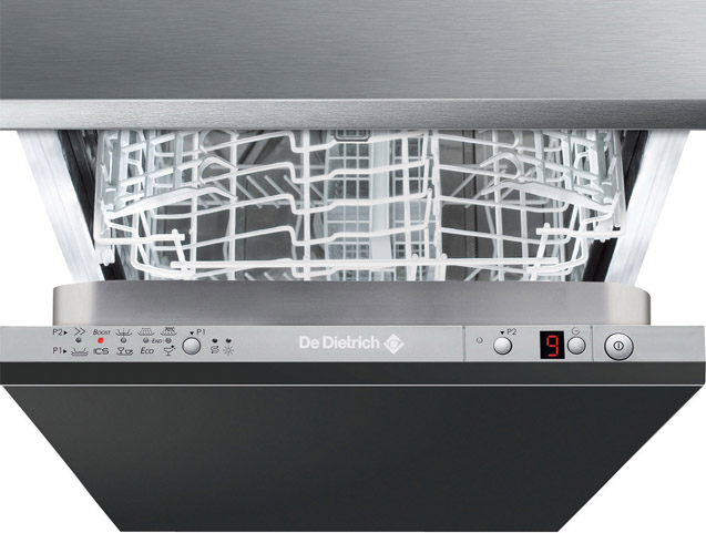 Посудомоечная машина De Dietrich DVY 1010 полностью встраивается, значит она впишется в любой стиль кухни. После установки и подключения электронная панель управления и дисплей окажутся закрытыми от случайного доступа.
