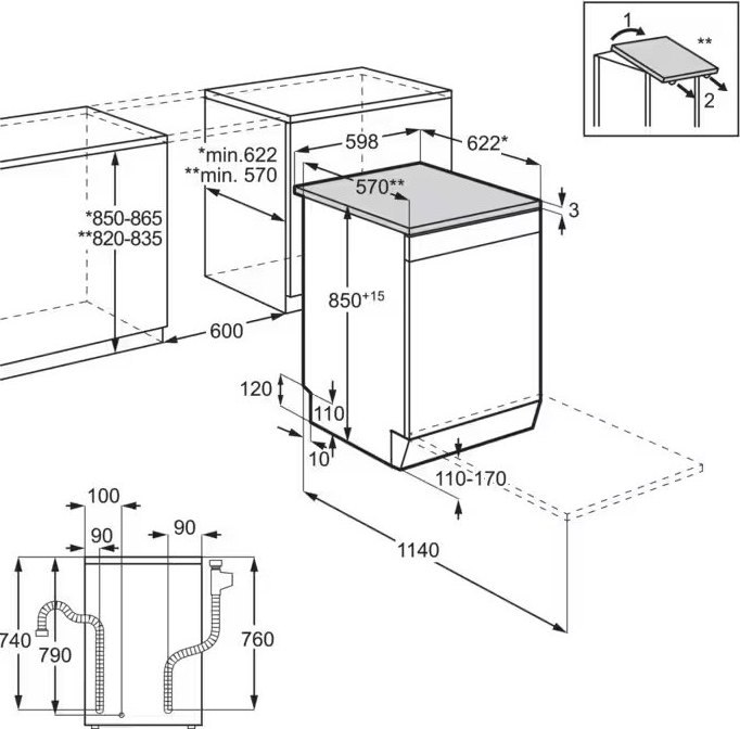 Большая часть полноразмерных и узких посудомоек встраиваемого и отдельностоящего вида имеет высоту около 82-85 см: такие модели легко размещаются под столешницей. Встраиваемые модели несколько ниже, так как у них отсутствует верхняя крышка.