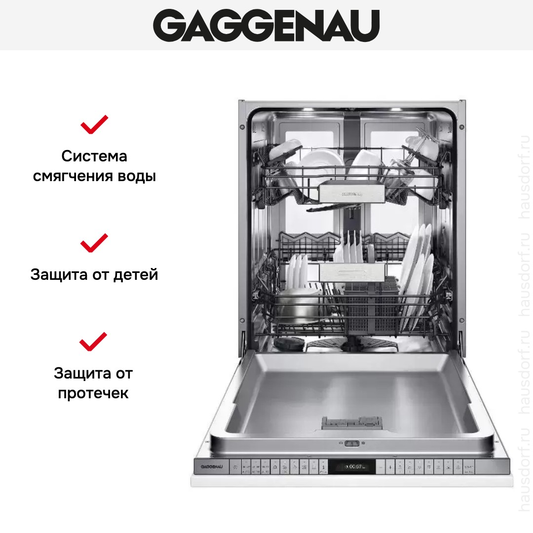 Модель Гаггенау имеет стандартные размеры — высоту 81,5 см, ширину 59,8 см, глубину 55 см. Для различных типов загрязнений и видов посуды предназначены 8 автоматических программ и 6 дополнительных опций, включая ускоренную мойку, интенсивную сушку, половинную загрузку и другие. — Сенсорное управление с TFT-дисплеем позволяет выбрать программу, отображает время до ее окончания, наличие соли, ополаскивателя, подачу воды. Имеется информационная клавиша для выдачи сведений о выбранной программе и настройкам. Таймер отсрочки старта поможет спланировать запуск на следующие сутки.