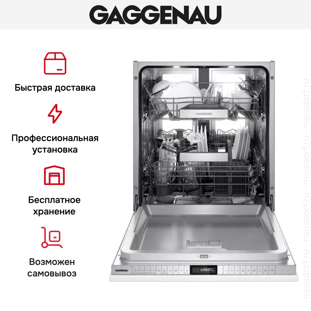 Встраиваемая модель Гаггенау отлично впишется в любой интерьер, главное — правильно выбрать место, чтобы подвести коммуникации. Устанавливается в нишу целиком, полностью закрывается декоративной панелью. Обратите внимание: в комплекте не идет фасад, его необходимо установить самостоятельно. Имеет стандартные размеры, поэтому может не поместиться на очень маленькой кухне. В камеру можно загрузить ограниченное число комплектов: 12 шт. Комплектом считается набор посуды на одного человека, который нужен для полноценного приема пищи: глубокая и плоская тарелки, тарелка для салата, блюдце под чашку, сама чашка, ложка и вилка.