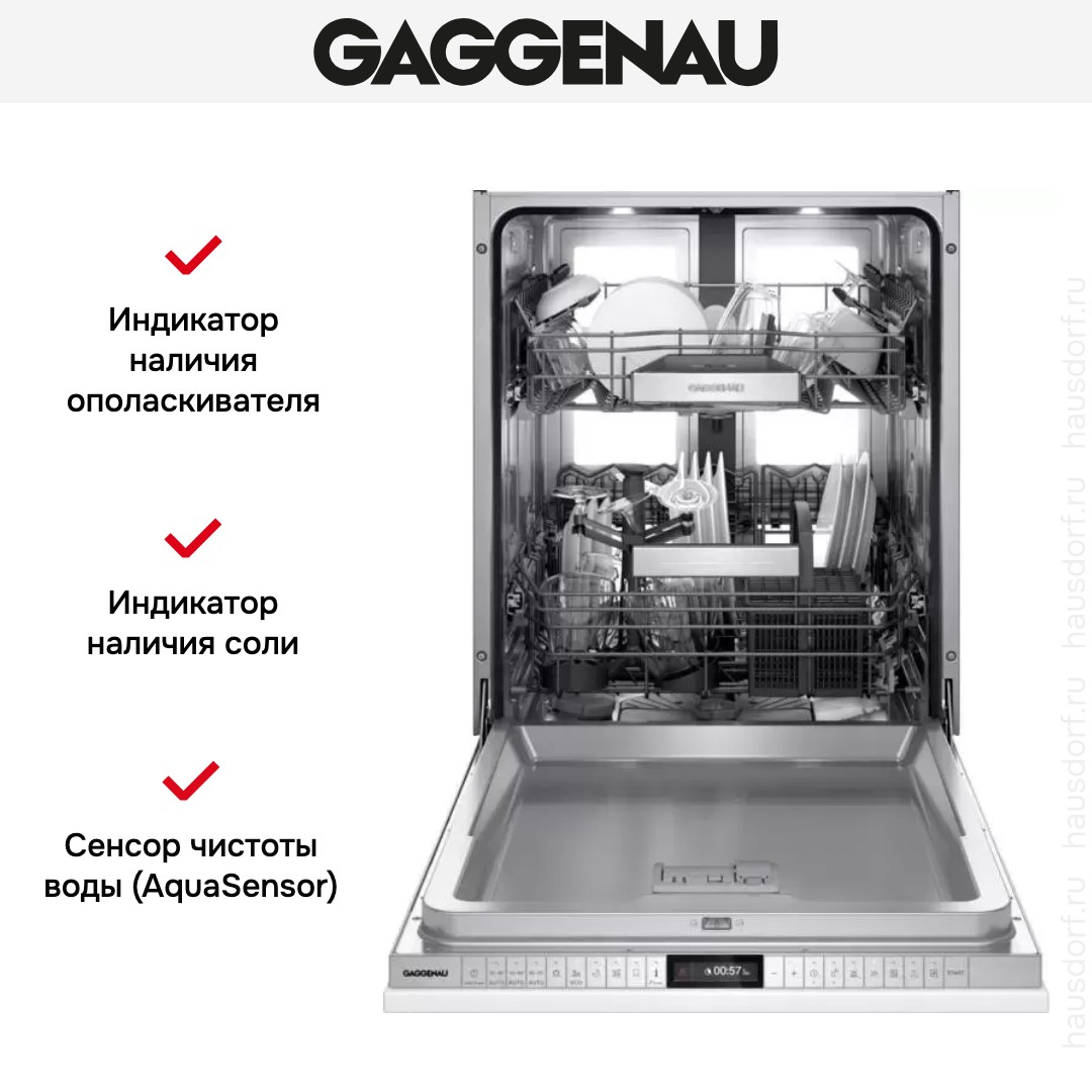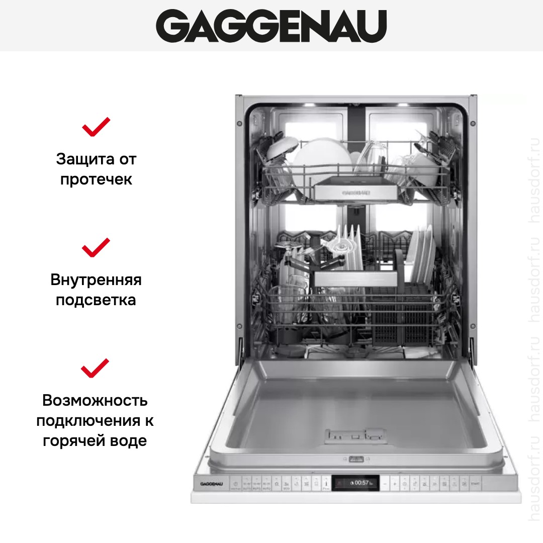 Встраиваемая модель Гаггенау отлично впишется в любой интерьер, главное — правильно выбрать место, чтобы подвести коммуникации. Устанавливается в нишу целиком, полностью закрывается декоративной панелью. Обратите внимание: в комплекте не идет фасад, его необходимо установить самостоятельно. Имеет стандартные размеры, поэтому может не поместиться на очень маленькой кухне. В камеру можно загрузить ограниченное число комплектов: 12 шт. Комплектом считается набор посуды на одного человека, который нужен для полноценного приема пищи: глубокая и плоская тарелки, тарелка для салата, блюдце под чашку, сама чашка, ложка и вилка.