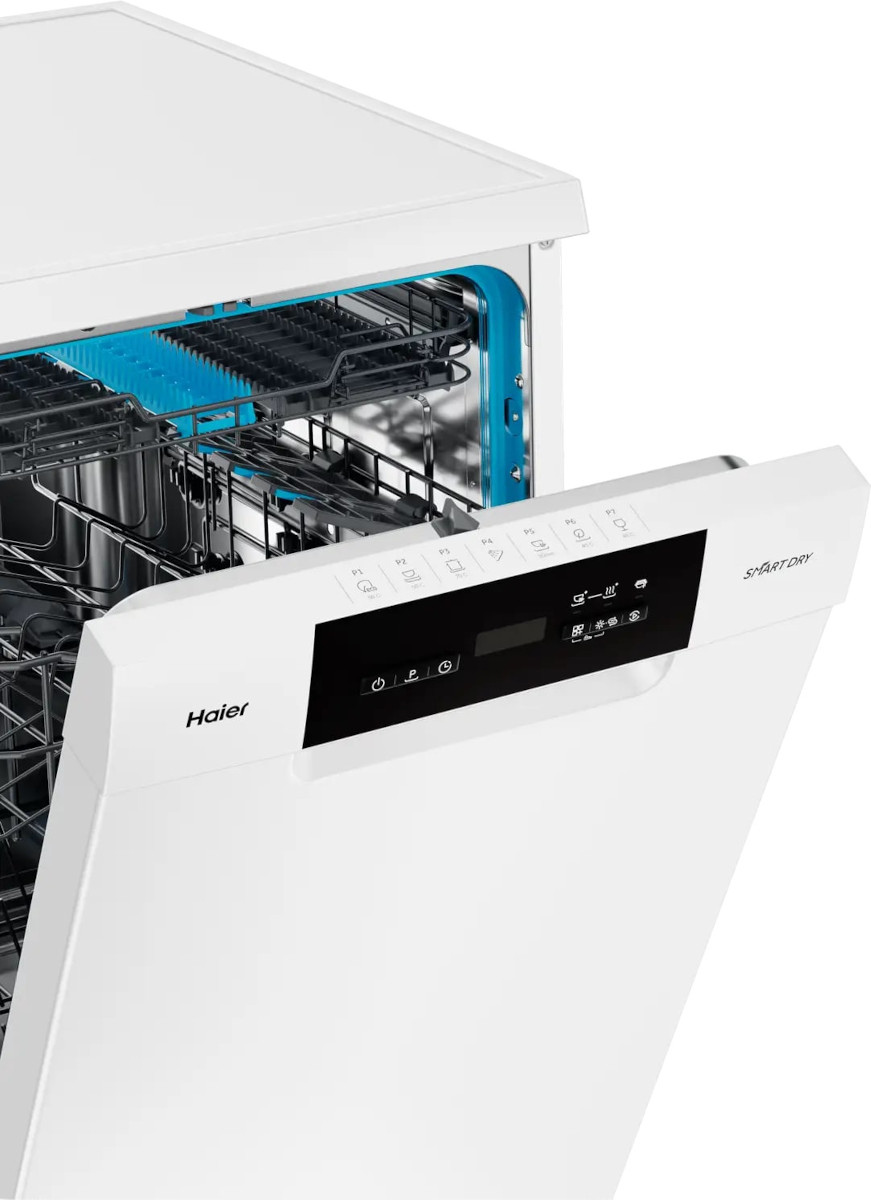 Отдельностоящая модель Хайер отлично впишется в кухонный интерьер, главное — правильно выбрать место, чтобы подвести коммуникации. Устанавливается в нишу неполностью, остается открытой панель управления. Имеет уменьшенную ширину — благодаря этому поместится даже на очень маленькой кухне. В камеру можно загрузить ограниченное число комплектов: 11 шт. Комплектом считается набор посуды на одного человека, который нужен для полноценного приема пищи: глубокая и плоская тарелки, тарелка для салата, блюдце под чашку, сама чашка, ложка и вилка.