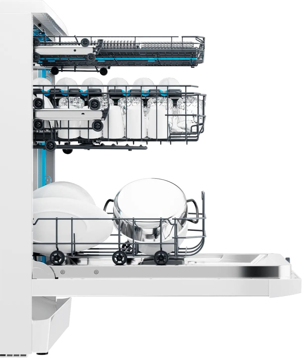Полноразмерные модели выбирают в больших семьях, а также те, кто много готовит или часто принимает гостей. Их вместимость может составить до 15 комплектов посуды, а габаритные размеры соответствуют размерам стандартной кухонной мебели шириной и глубиной 60 см и высотой 82-85 см. Они выпускаются как во встраиваемом, так и в отдельностоящем варианте: во втором случае для установки понадобится достаточно много места. Как правило, полноразмерные приборы отличаются большим набором стандартных и специальных программ мойки, а также дополнительных опций: в частности, они оснащаются третьей корзиной для мытья столовых приборов.