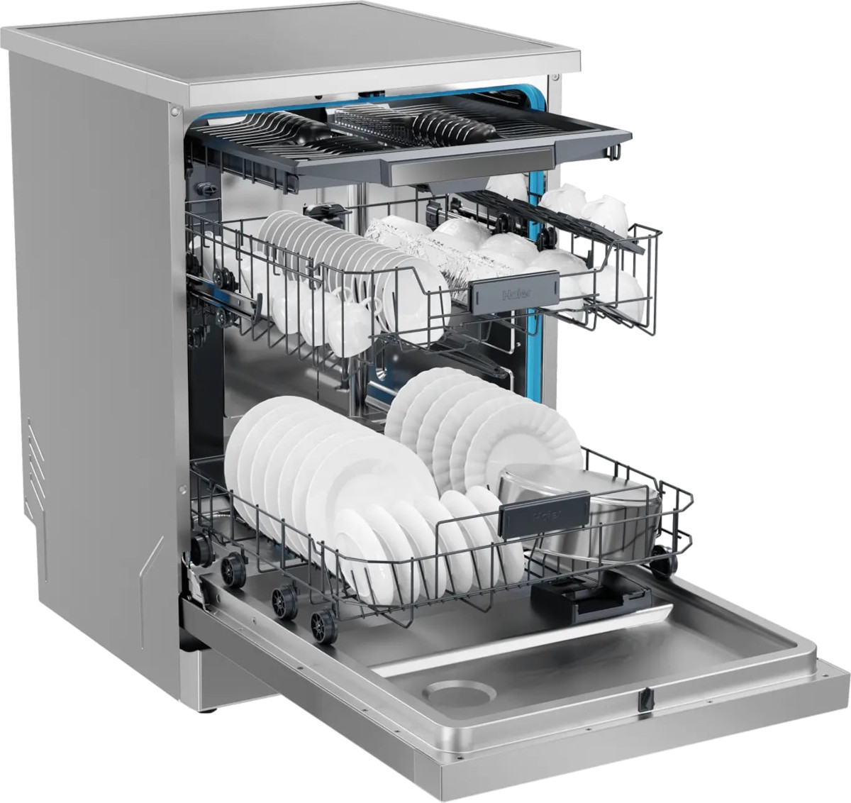 Отдельностоящая модель Хайер отлично впишется в кухонный интерьер, главное — правильно выбрать место, чтобы подвести коммуникации. Устанавливается в нишу неполностью, остается открытой панель управления. Имеет стандартные размеры, поэтому может не поместиться на очень маленькой кухне. В камеру можно загрузить ограниченное число комплектов: 15 шт. Комплектом считается набор посуды на одного человека, который нужен для полноценного приема пищи: глубокая и плоская тарелки, тарелка для салата, блюдце под чашку, сама чашка, ложка и вилка.