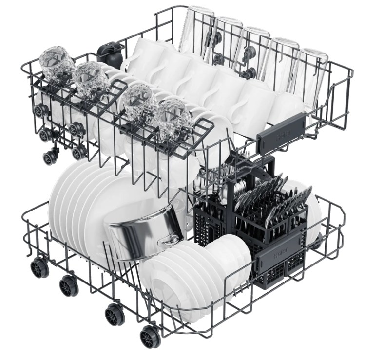 Встраиваемая модель Хайер отлично впишется в любой интерьер, главное — правильно выбрать место, чтобы подвести коммуникации. Устанавливается в нишу целиком, полностью закрывается декоративной панелью. Имеет стандартные размеры, поэтому может не поместиться на очень маленькой кухне. В камеру можно загрузить ограниченное число комплектов: 14 шт. Комплектом считается набор посуды на одного человека, который нужен для полноценного приема пищи: глубокая и плоская тарелки, тарелка для салата, блюдце под чашку, сама чашка, ложка и вилка.