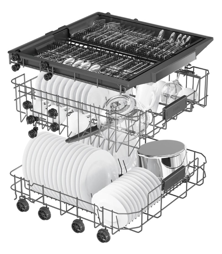 Корзина для столовых приборов достаточно высока, ввиду чего она устанавливается в нижнем коробе, где для нее предусматривается специальное место между разделителями для тарелок. Приборы в корзине могут размещаться как вниз, так и вверх рукоятками — это зависит от количества приборов и требований пользователя. Однако острые предметы — ножи или вилки — необходимо размещать острием вниз для предотвращения травм. Ножи рекомендуется размещать в корзинах с осторожностью, поскольку лезвия из керамики, например, могут затупиться. Чтобы избежать этого, следует использовать фирменные моющие средства и обязательно располагать ножи по отдельности, чтобы они не соприкасались с другими предметами.