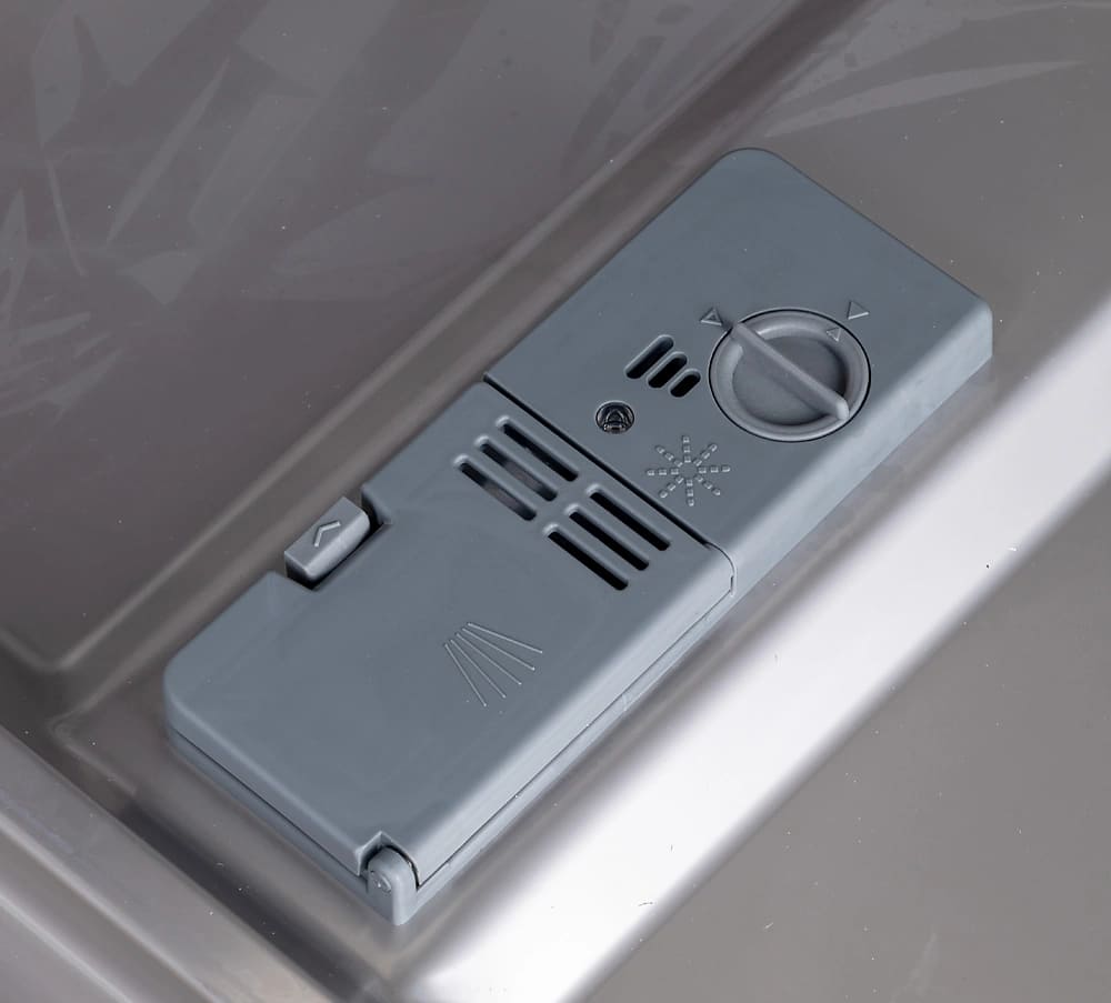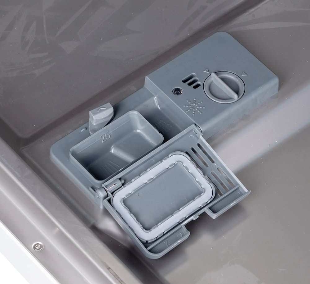 Чтобы смягчить водопроводную воду, в посудомоечных машинах устанавливается резервуар, куда загружается специальная соль. Перед первым использованием посудомойки необходимо выяснить уровень жесткости воды и отрегулировать систему смягчения. По умолчанию в машинах устанавливается средний уровень жесткости. Узнать уровень жесткости в той или иной местности можно при помощи специальных приборов или тест-полосок. Также эти сведения можно получить в соответствующей организации.