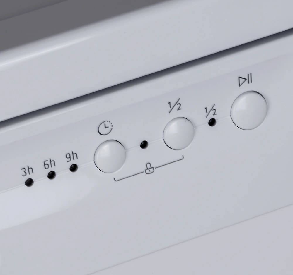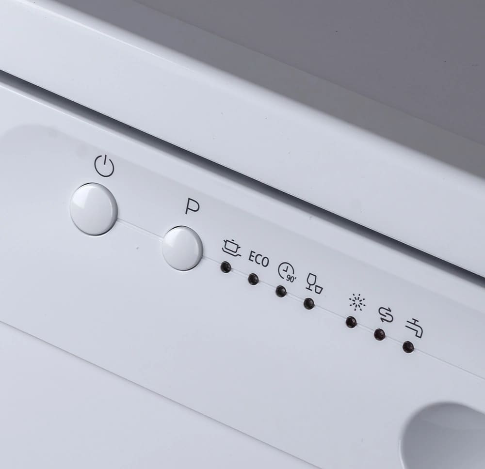 Кнопки на панели управления посудомоечных машин позволяют быстро выбирать одну из стандартных программ мытья, задавать дополнительные опции. Расположение панели управления обычно определяется типом посудомоечной машины. У встраиваемых моделей кнопки, дисплей и индикаторы располагаются на торце дверцы, поскольку в передней части навешивается декоративный мебельный фасад. Отдельностоящие машины могут оснащаться панелью управления, расположенной расположена на фасадной части.