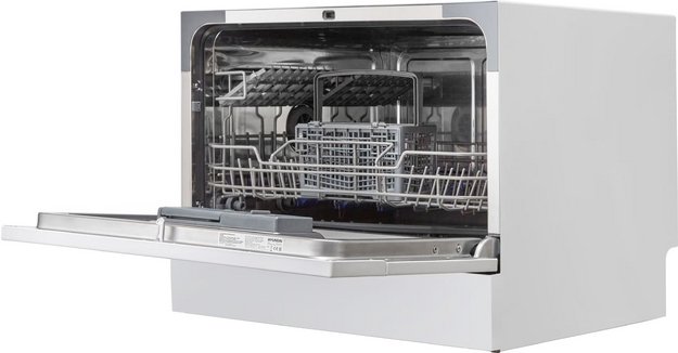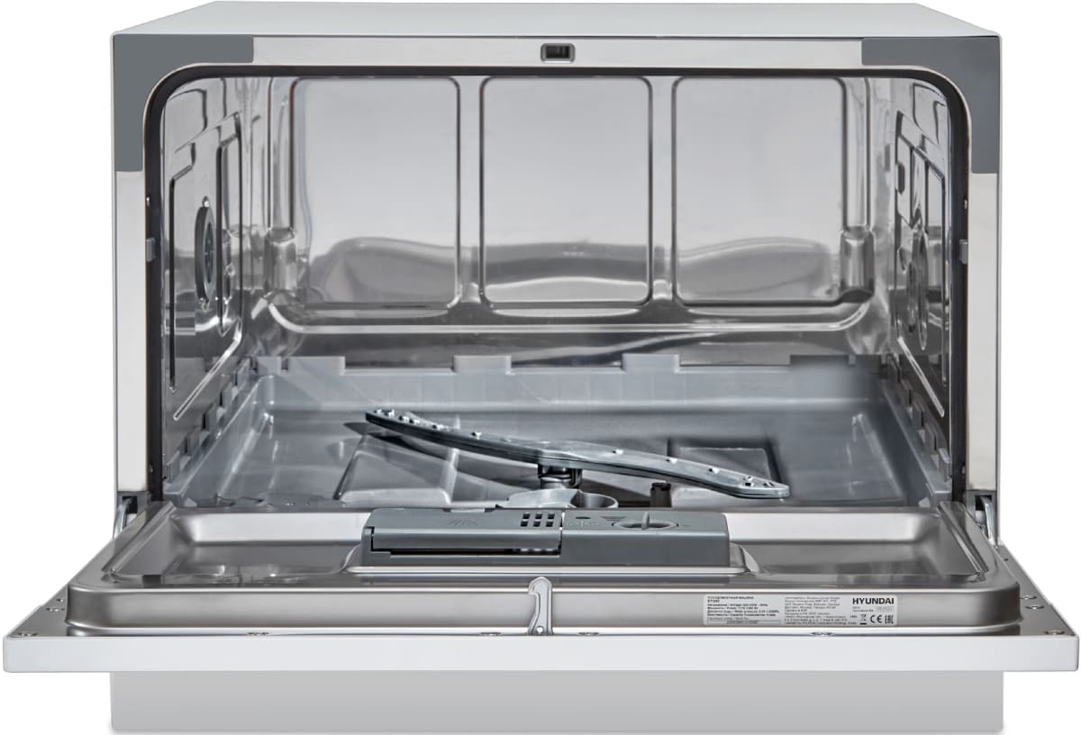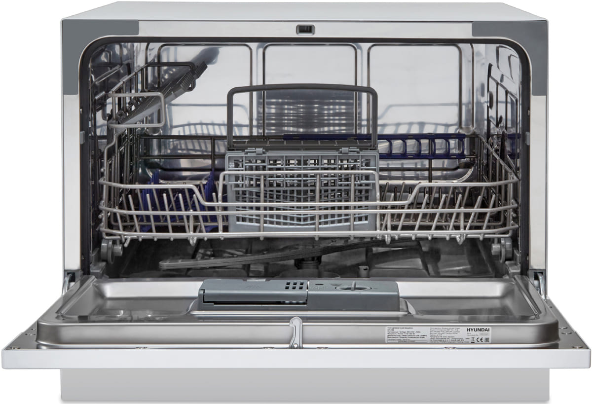 Отдельностоящая модель Хендай отлично впишется в кухонный интерьер, главное — правильно выбрать место, чтобы подвести коммуникации. Компактные размеры позволяют разместить ее даже на очень маленькой кухне. В камеру можно загрузить ограниченное число комплектов: 6 шт. Комплектом считается набор посуды на одного человека, который нужен для полноценного приема пищи: глубокая и плоская тарелки, тарелка для салата, блюдце под чашку, сама чашка, ложка и вилка.