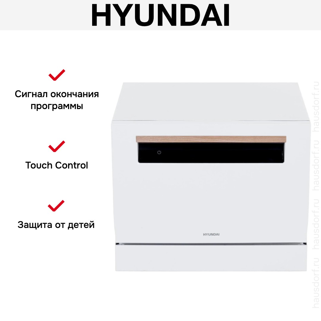 Посудомоечная машина Hyundai DT304 — компактный отдельно стоящий агрегат в белом корпусе с черной открытой сенсорной панелью. Его габариты 44×50×55 см делают устройство идеальным выбором для малогабаритных кухонь и кухонных ниш. Лаконичный внешний вид сочетается с удобной кнопочной панелью включения и выбора программ. Цифровой дисплей показывает оставшееся время в минутах, а звуковой сигнал оповещает об окончании цикла.
