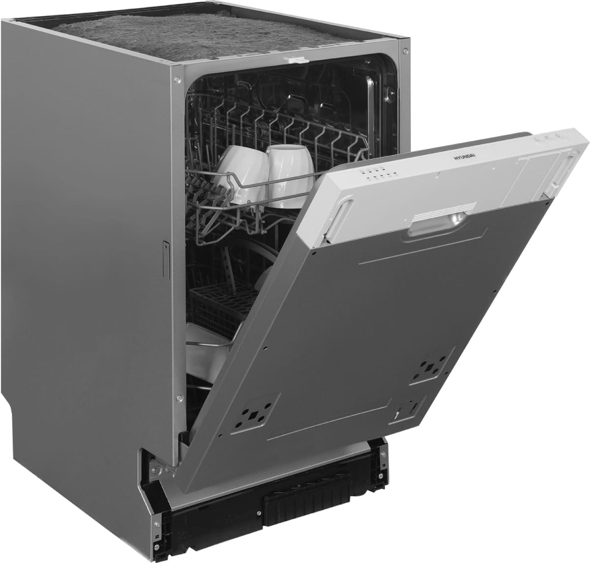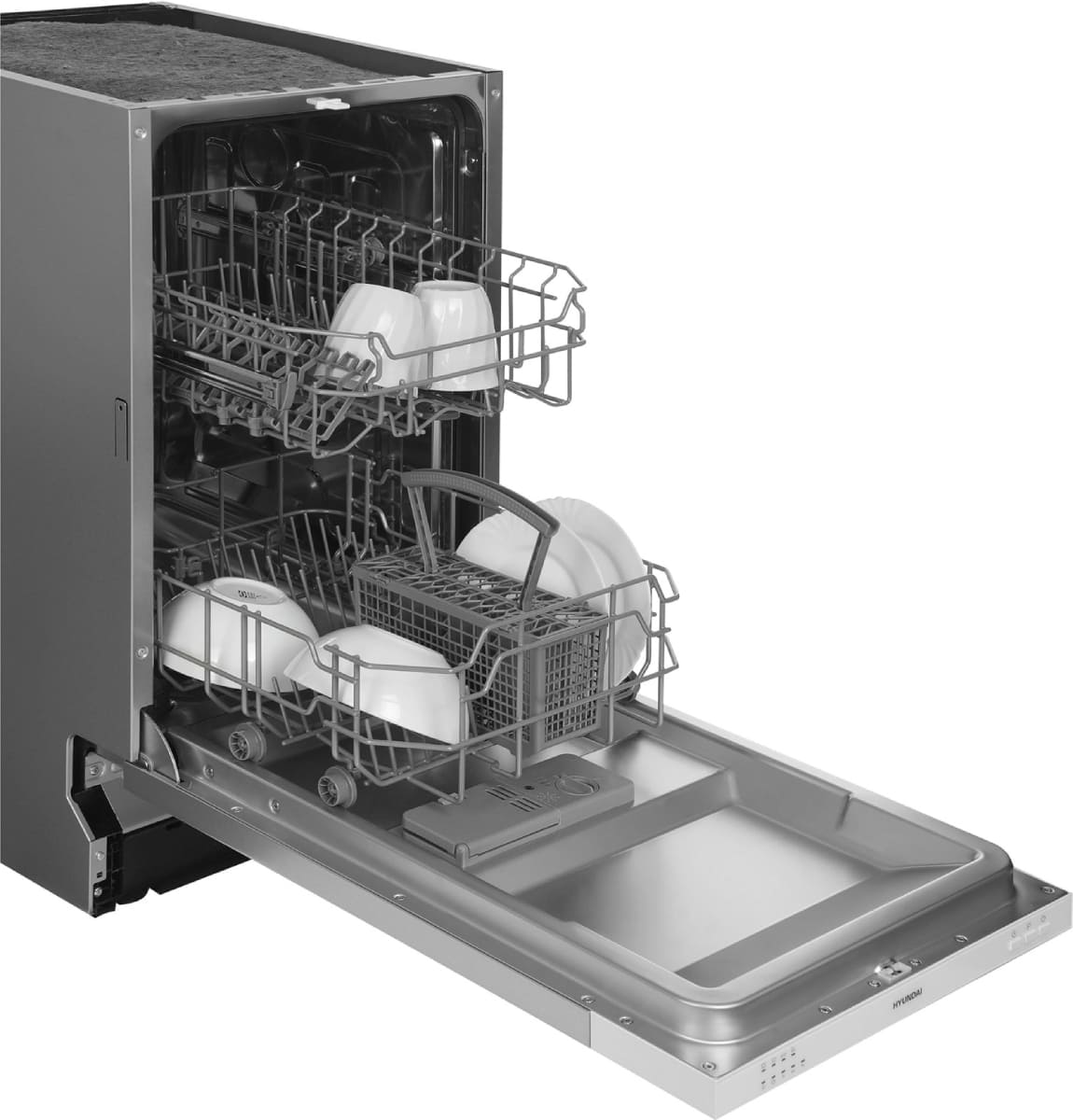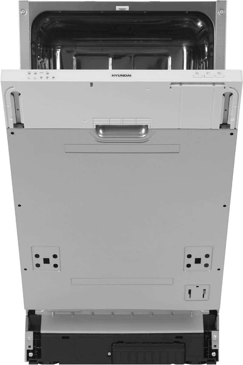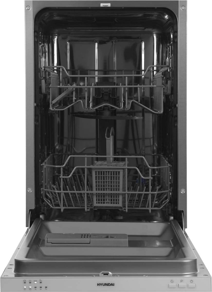 Встраиваемая модель Хендай отлично впишется в любой интерьер, главное — правильно выбрать место, чтобы подвести коммуникации. Устанавливается в нишу целиком, полностью закрывается декоративной панелью. Обратите внимание: в комплекте не идет фасад, его необходимо установить самостоятельно. Имеет уменьшенную ширину — благодаря этому поместится даже на очень маленькой кухне. В камеру можно загрузить ограниченное число комплектов: 9 шт. Комплектом считается набор посуды на одного человека, который нужен для полноценного приема пищи: глубокая и плоская тарелки, тарелка для салата, блюдце под чашку, сама чашка, ложка и вилка.