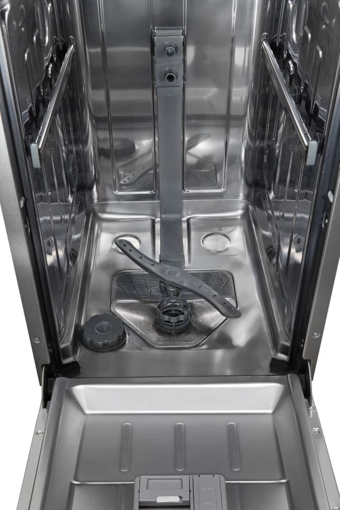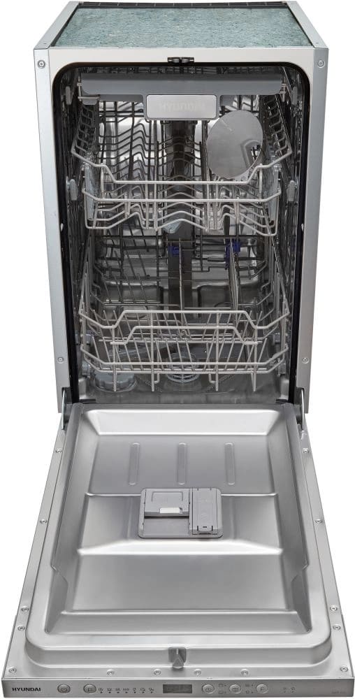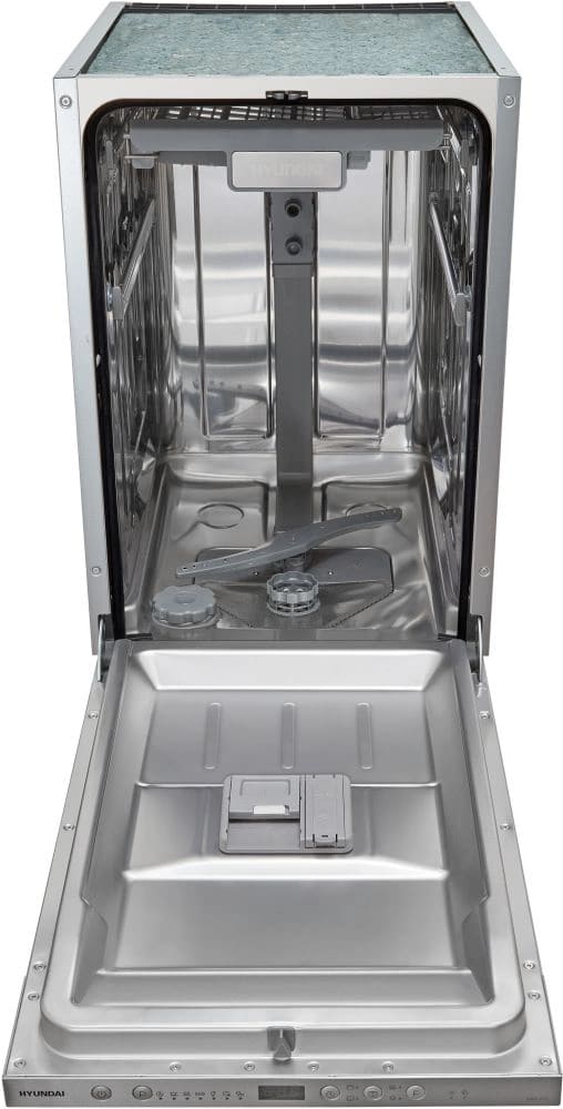 Встраиваемая модель Хендай отлично впишется в любой интерьер, главное — правильно выбрать место, чтобы подвести коммуникации. Устанавливается в нишу целиком, полностью закрывается декоративной панелью. Обратите внимание: в комплекте не идет фасад, его необходимо установить самостоятельно. Имеет уменьшенную ширину — благодаря этому поместится даже на очень маленькой кухне. В камеру можно загрузить ограниченное число комплектов: 10 шт. Комплектом считается набор посуды на одного человека, который нужен для полноценного приема пищи: глубокая и плоская тарелки, тарелка для салата, блюдце под чашку, сама чашка, ложка и вилка.