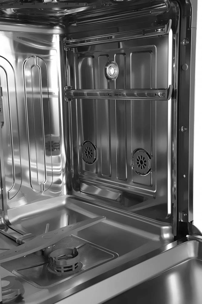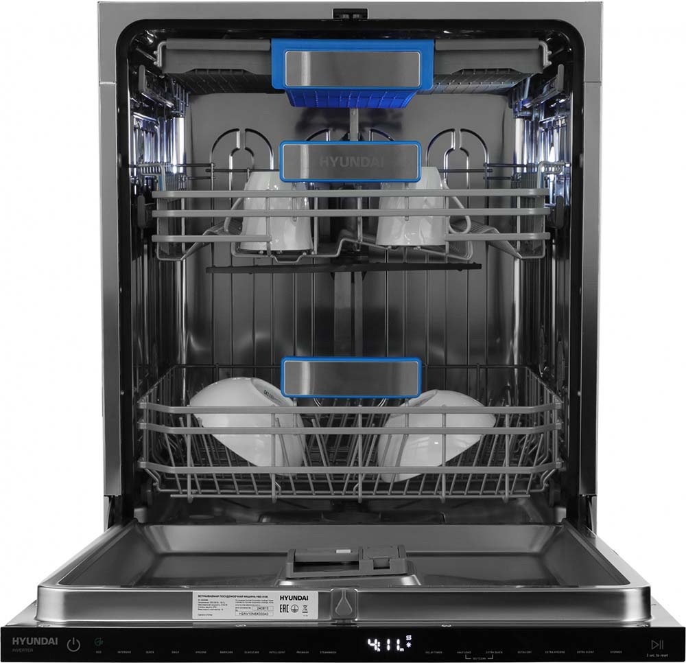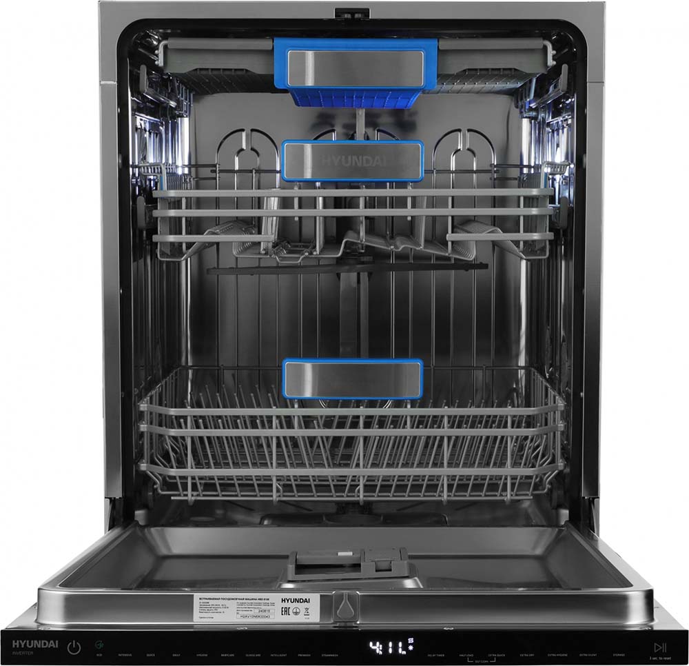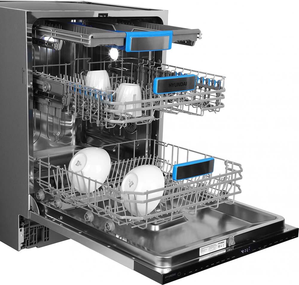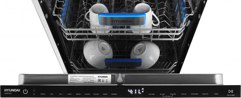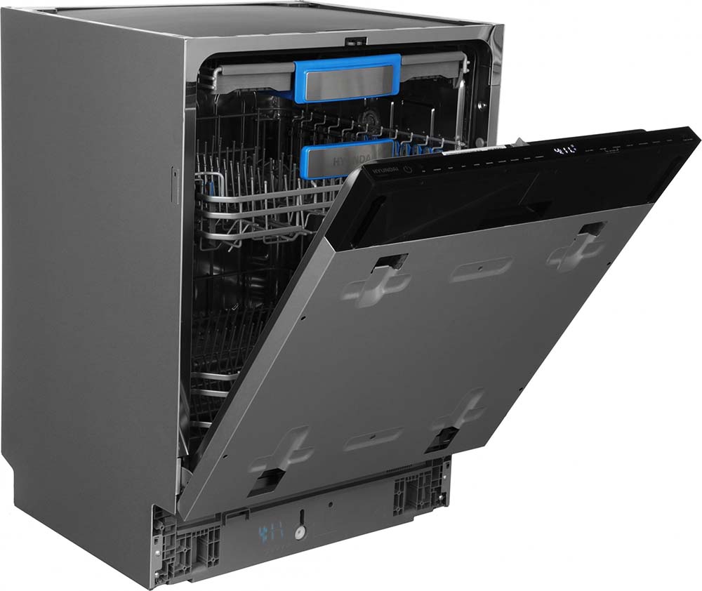 Встраиваемая модель Хендай отлично впишется в любой интерьер, главное — правильно выбрать место, чтобы подвести коммуникации. Устанавливается в нишу целиком, полностью закрывается декоративной панелью. Обратите внимание: в комплекте не идет фасад, его необходимо установить самостоятельно. Имеет стандартные размеры, поэтому может не поместиться на очень маленькой кухне. В камеру можно загрузить ограниченное число комплектов: 16 шт. Комплектом считается набор посуды на одного человека, который нужен для полноценного приема пищи: глубокая и плоская тарелки, тарелка для салата, блюдце под чашку, сама чашка, ложка и вилка.