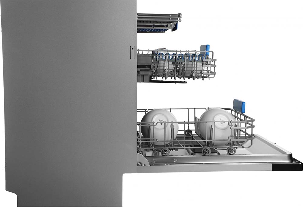 Полноразмерные модели выбирают в больших семьях, а также те, кто много готовит или часто принимает гостей. Их вместимость может составить до 15 комплектов посуды, а габаритные размеры соответствуют размерам стандартной кухонной мебели шириной и глубиной 60 см и высотой 82-85 см. Они выпускаются как во встраиваемом, так и в отдельностоящем варианте: во втором случае для установки понадобится достаточно много места. Как правило, полноразмерные приборы отличаются большим набором стандартных и специальных программ мойки, а также дополнительных опций: в частности, они оснащаются третьей корзиной для мытья столовых приборов.