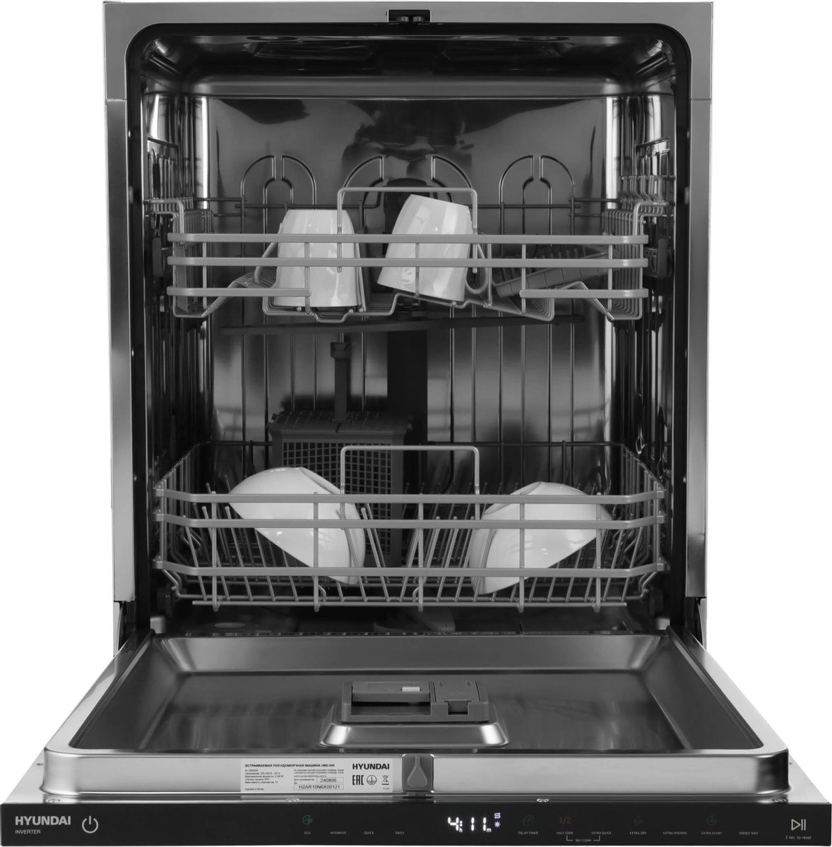 Встраиваемая модель Хендай отлично впишется в любой интерьер, главное — правильно выбрать место, чтобы подвести коммуникации. Устанавливается в нишу целиком, полностью закрывается декоративной панелью. Имеет стандартные размеры, поэтому может не поместиться на очень маленькой кухне. В камеру можно загрузить ограниченное число комплектов: 13 шт. Комплектом считается набор посуды на одного человека, который нужен для полноценного приема пищи: глубокая и плоская тарелки, тарелка для салата, блюдце под чашку, сама чашка, ложка и вилка.