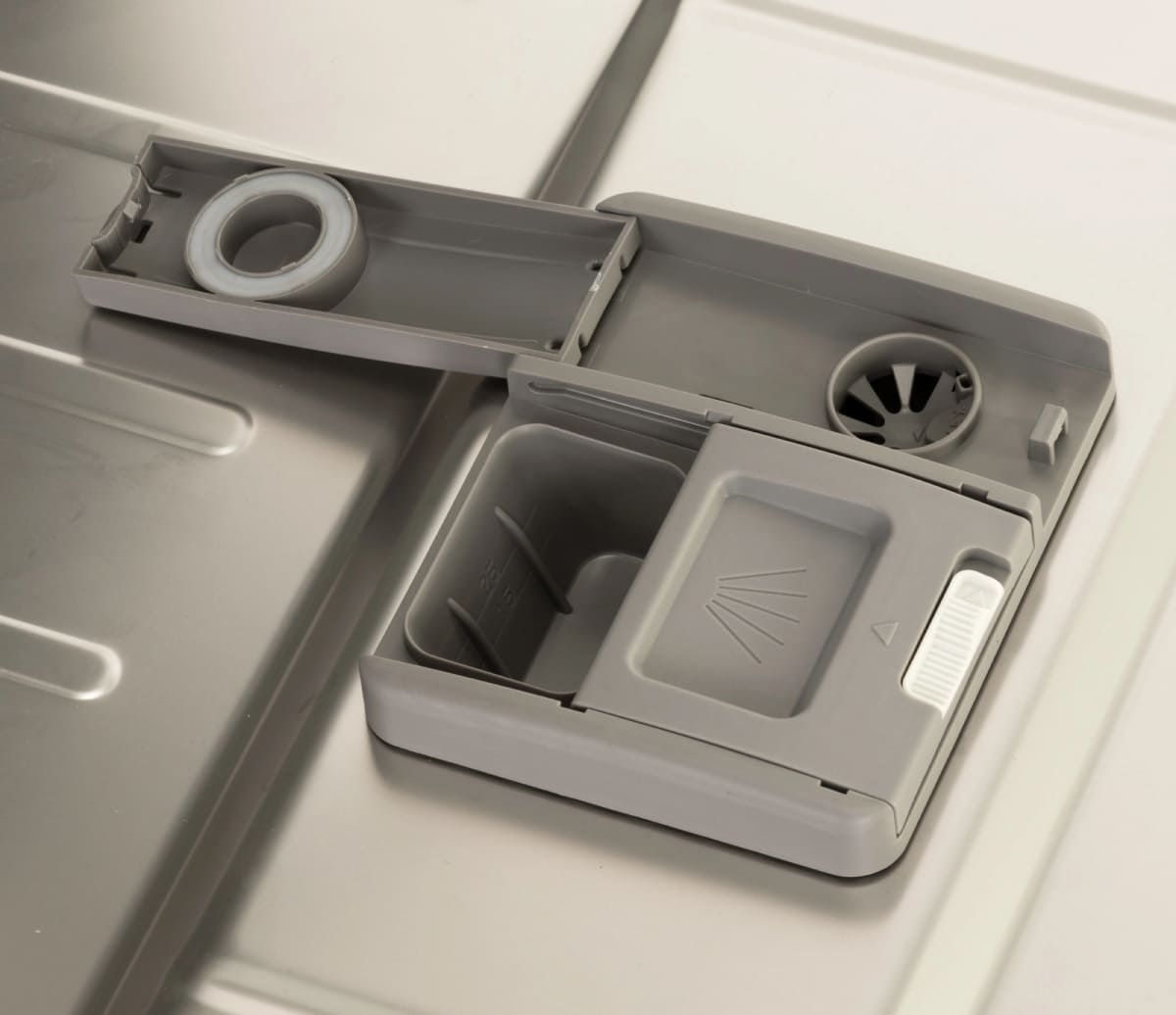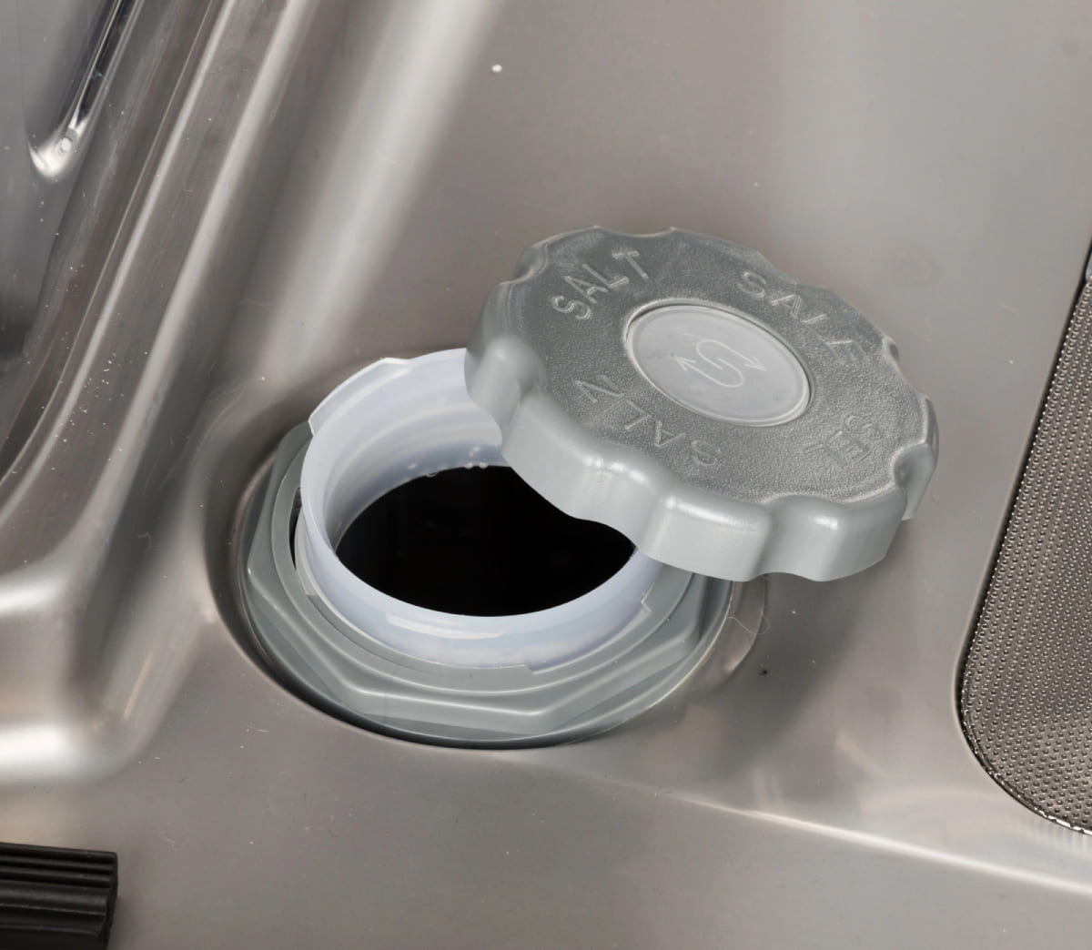 Для качественного мытья требуются три компонента. Порошок служит для удаления загрязнений. Ополаскиватель на последнем этапе рабочего цикла гарантирует скатывание капель воды и придает посуде эффектный блеск. Соль нейтрализует примеси, содержащиеся в жесткой водопроводной воде, и защищает внутренние поверхности и механизм посудомойки от накипи путем смягчения воды. Соль содержит ионы хлора, которые связывают ионы металлов, находящиеся в воде, и не дают им оседать в виде налета. Применение соли необходимо для стабильной работы машины, причем заменять ее обычной поваренной солью не рекомендуется.