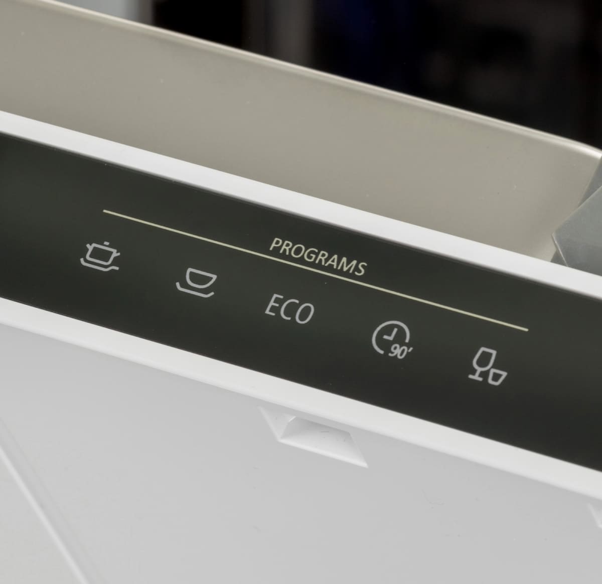 Кнопки на панели управления посудомоечных машин позволяют быстро выбирать одну из стандартных программ мытья, задавать дополнительные опции. Расположение панели управления обычно определяется типом посудомоечной машины. У встраиваемых моделей кнопки, дисплей и индикаторы располагаются на торце дверцы, поскольку в передней части навешивается декоративный мебельный фасад. Отдельностоящие машины могут оснащаться панелью управления, расположенной расположена на фасадной части.