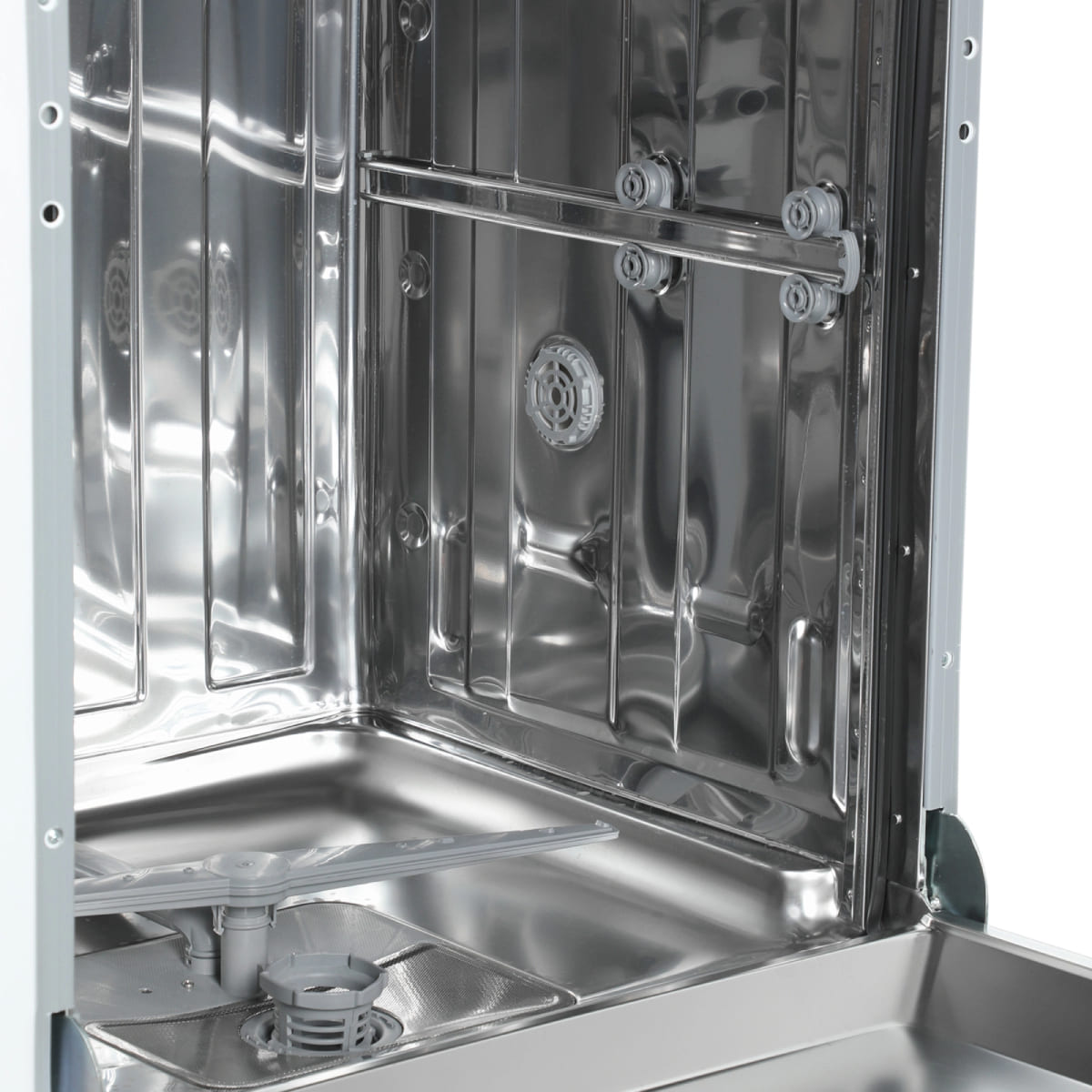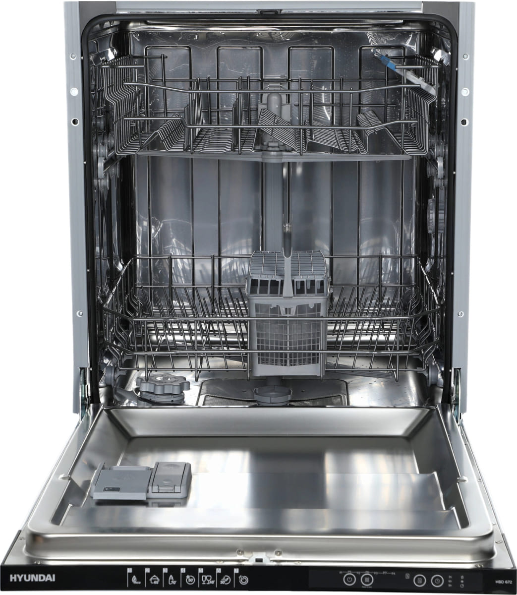 Встраиваемая модель Хендай отлично впишется в любой интерьер, главное — правильно выбрать место, чтобы подвести коммуникации. Устанавливается в нишу целиком, полностью закрывается декоративной панелью. Обратите внимание: в комплекте не идет фасад, его необходимо установить самостоятельно. Имеет стандартные размеры, поэтому может не поместиться на очень маленькой кухне. В камеру можно загрузить ограниченное число комплектов: 12 шт. Комплектом считается набор посуды на одного человека, который нужен для полноценного приема пищи: глубокая и плоская тарелки, тарелка для салата, блюдце под чашку, сама чашка, ложка и вилка.