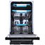Узкие посудомоечные машины при стандартной высоте около 85 см и глубине 60 см имеют небольшую ширину порядка 45 см. Эти устройства выпускаются в основном во встраиваемом варианте. Их выбирают для установки в малометражных кухнях, для небольших семей из двух-трех человек, а также в случае, если пользователи нечасто готовят дома. Вместимость узких машин может составить от 5 до 10 комплектов посуды, а по своему функционалу, классу мытья, разнообразию типов сушки они постепенно приближаются к полноразмерным моделям. Компактные модели рассчитаны на одного-двух человек. Их высота составляет всего 45 см, а ширина и глубина достигают 50-55 см. Вместимость подобных устройств не превышает 3-6 стандартных комплектов посуды. Производители предлагают как встраиваемые, так и отдельностоящие модели таких посудомоек: вторые обычно выделяют в отдельную категорию настольных. Они уступают узким и полноразмерным не только по вместимости, но и по набору функций, который включает, как правило, несколько стандартных программ.
