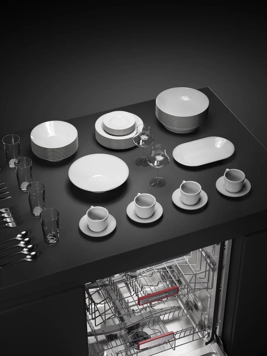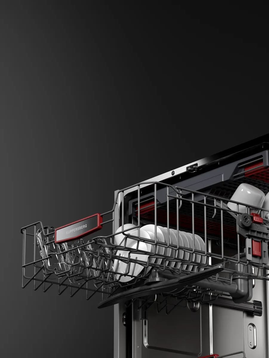 Встраиваемая модель Куперсберг отлично впишется в любой интерьер, главное — правильно выбрать место, чтобы подвести коммуникации. Устанавливается в нишу целиком, полностью закрывается декоративной панелью. Обратите внимание: в комплекте не идет фасад, его необходимо установить самостоятельно. Имеет стандартные размеры, поэтому может не поместиться на очень маленькой кухне. В камеру можно загрузить ограниченное число комплектов: 16 шт. Комплектом считается набор посуды на одного человека, который нужен для полноценного приема пищи: глубокая и плоская тарелки, тарелка для салата, блюдце под чашку, сама чашка, ложка и вилка.