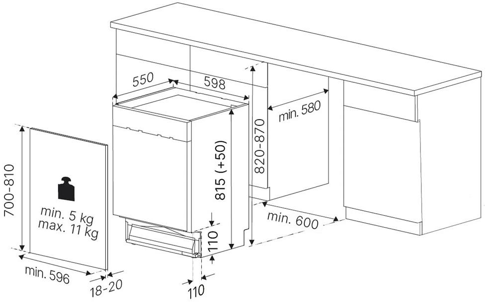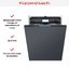 Полноразмерная и полностью встраиваемая посудомоечная машина выглядит сдержанно: фасад подбирается под кухонный гарнитур, а закрытая панель управления черного цвета скрыта во время работы. Диапазон по высоте 81.5-86.5 см при ширине 59.8 см и глубине 55 см помогает точно подогнать прибор под мебельную нишу. Внутренняя камера из нержавеющей стали с подсветкой подчеркивает аккуратную компоновку корзин.