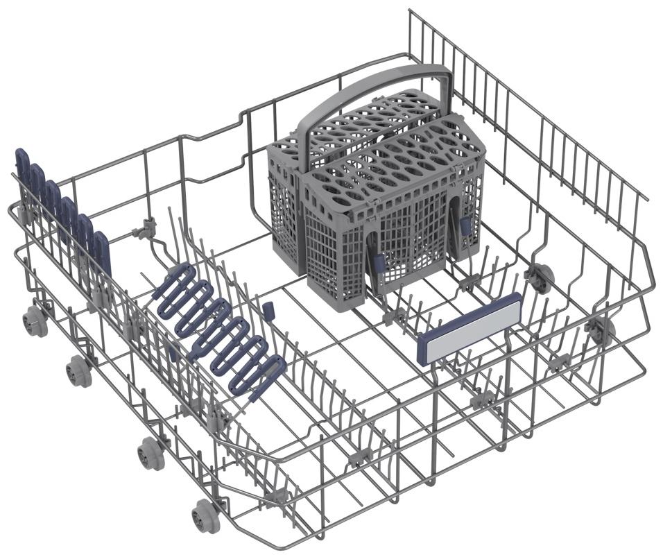 Корзина для столовых приборов — один из обязательных аксессуаров, которыми оснащается любая посудомоечная машина. Она представляет собой сетчатый пластиковый органайзер, в котором устанавливаются в вертикальном положении ложки, ножи и вилки. Корзина, как правило, разделяется на отдельные отсеки, в каждый из которых можно поместить один или несколько предметов. Зачастую сверху она закрывается специальной крышкой, которая также служит для разделения приборов, способствуя более тщательному их мытью.