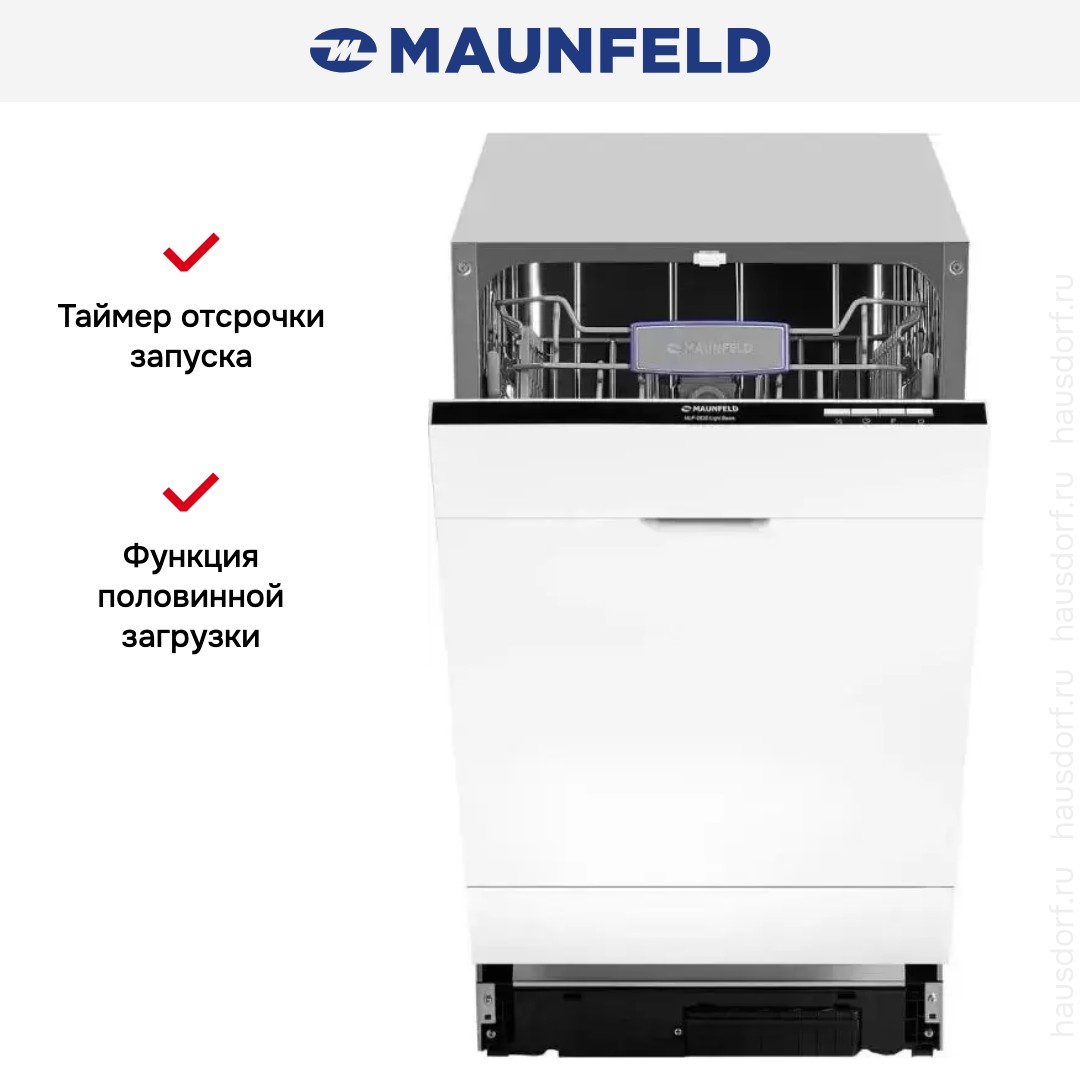 Посудомоечная машина Maunfeld MLP 082D Light Beam — полностью встраиваемая узкая модель, созданная для компактных кухонь и аккуратной интеграции под фасад гарнитура. Ее габариты 81.5—86.5×44.8×55 см и ниша для монтажа 82×45×57.5 см позволяют установить устройство даже в плотных планировках. Узкая ширина 44.8 см экономит место, при этом вместимость девять комплектов посуды делает прибор отличным решением для пары или небольшой семьи. Высота регулируется ножками, что помогает точно выровнять фронтальную панель с соседними ящиками.