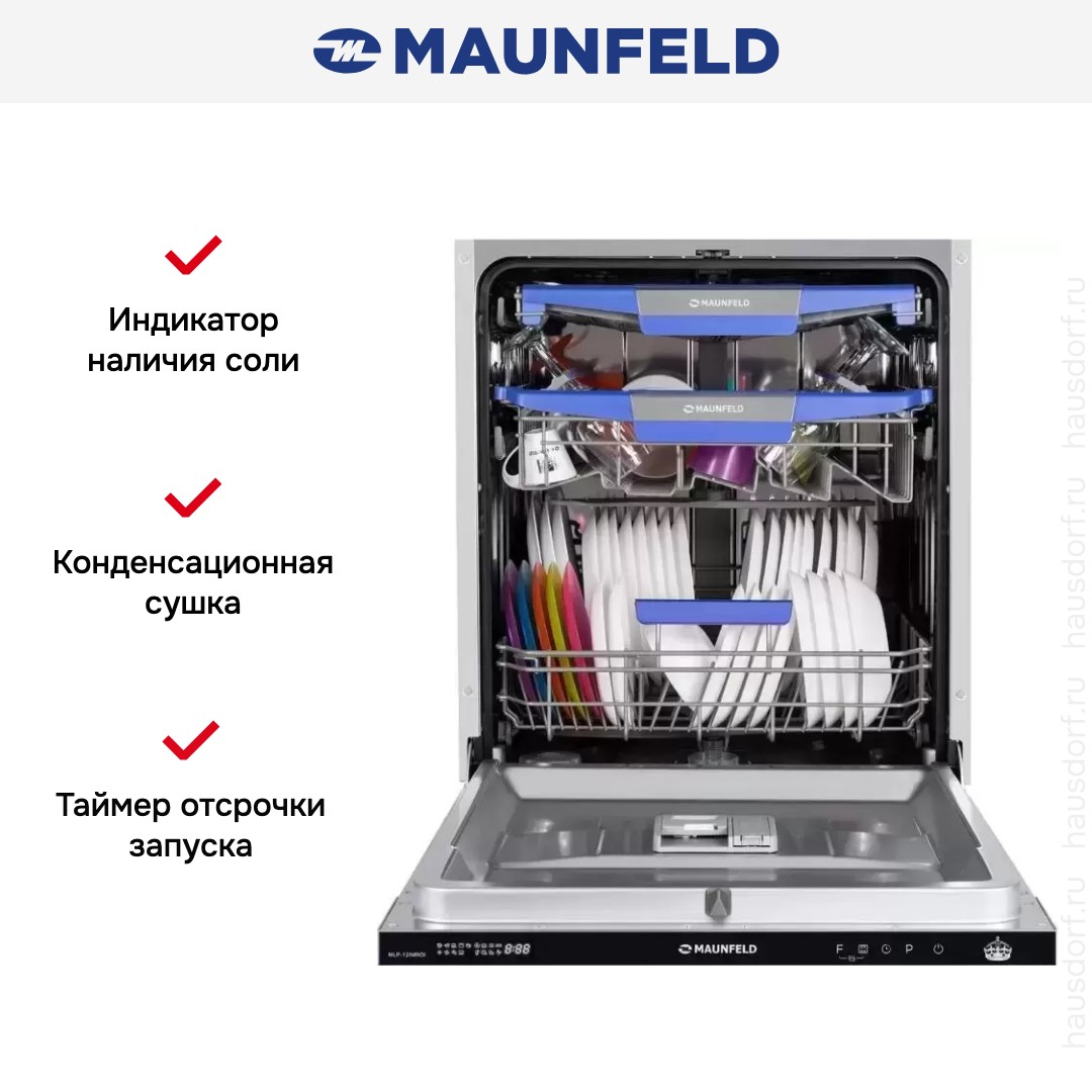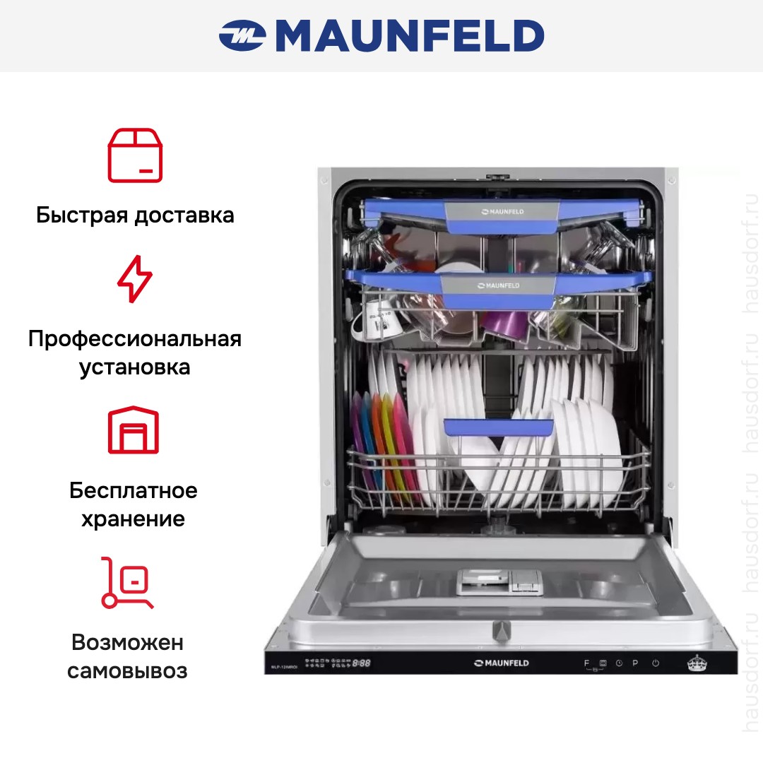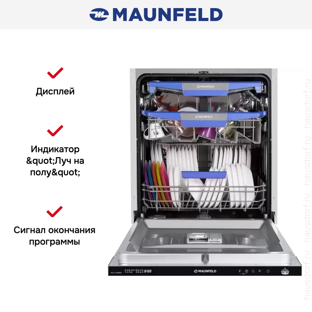 Посудомоечная машина Maunfeld MLP-12IMROI — полностью встраиваемый полноразмерный прибор, который прячется за фасадом и при этом сохраняет видимую панель управления черного цвета для удобного доступа. Ее компактная глубина 55 см делает установку в стандартные шкафы удобной, а высота 81,5 и ширина 59,8 см соответствуют классическим нишам. Специфические габариты ниши 82×60×55,5 см упрощают планирование монтажа, а в комплект входят все необходимые элементы для установки.