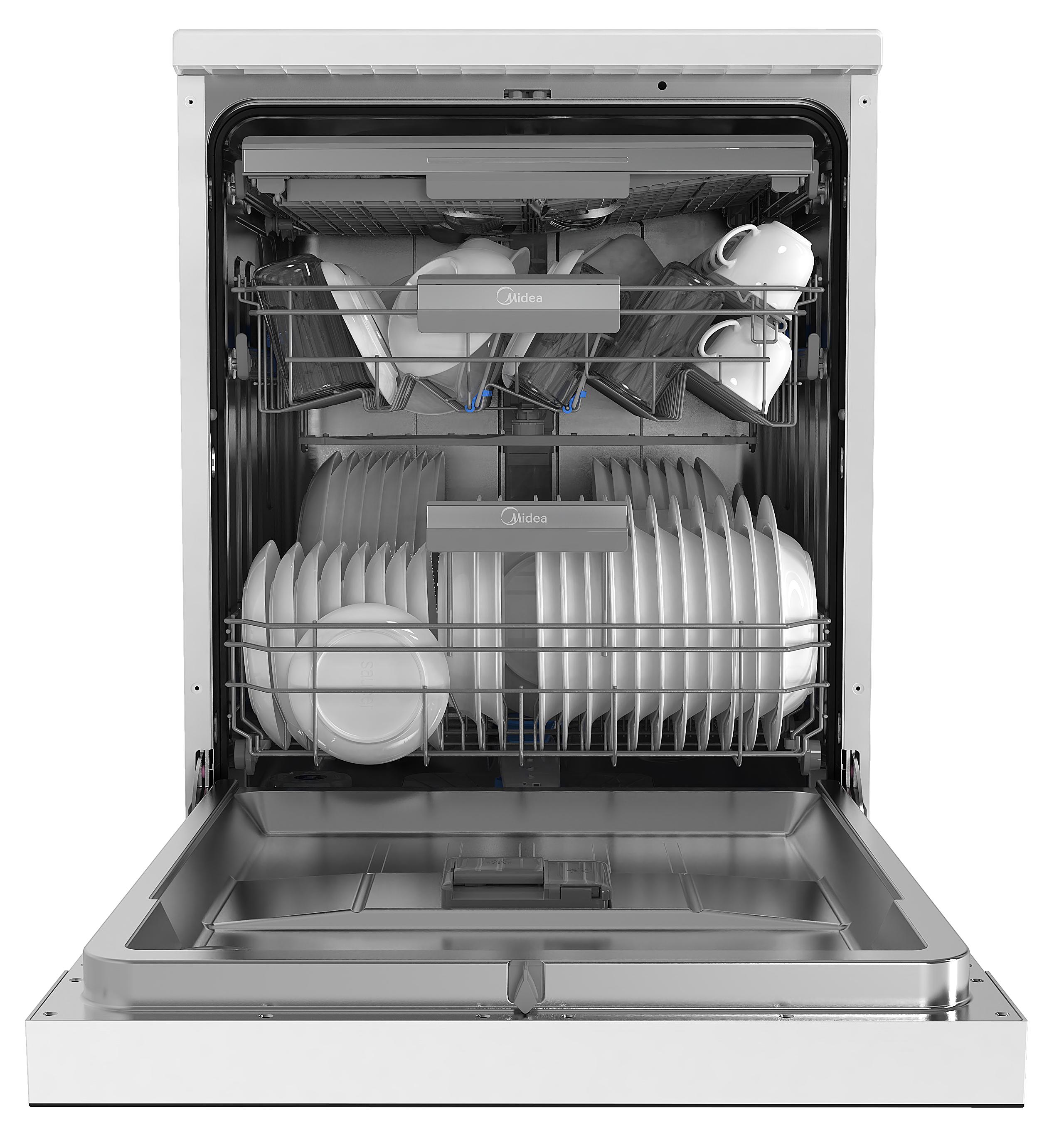 Отдельностоящая модель Мидеа отлично впишется в кухонный интерьер, главное — правильно выбрать место, чтобы подвести коммуникации. Имеет стандартные размеры, поэтому может не поместиться на очень маленькой кухне. В камеру можно загрузить ограниченное число комплектов: 14 шт. Комплектом считается набор посуды на одного человека, который нужен для полноценного приема пищи: глубокая и плоская тарелки, тарелка для салата, блюдце под чашку, сама чашка, ложка и вилка.