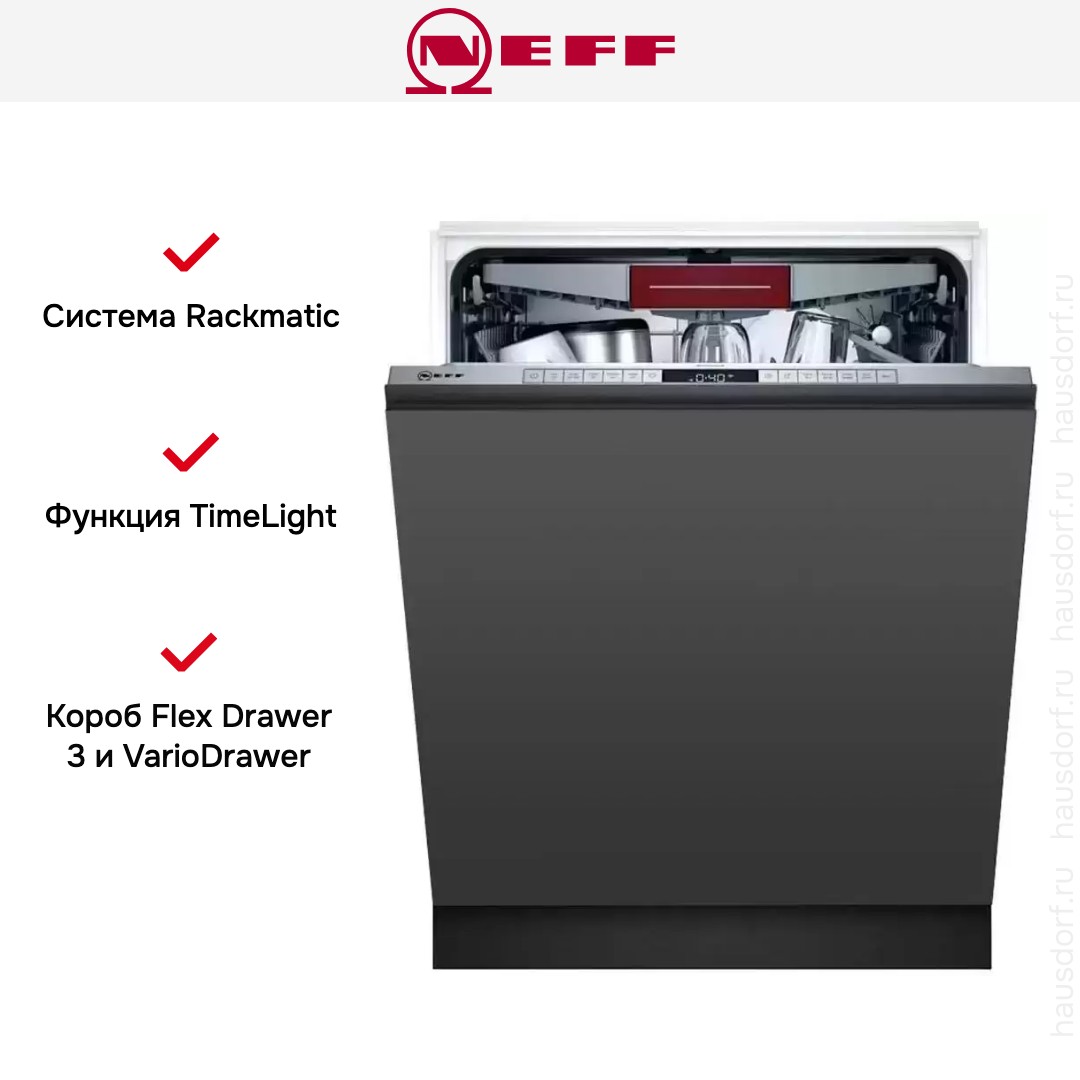 Посудомоечная машина Neff S177HMX10R полностью встраивается в мебельную нишу без возможности доукомплектовать ее декоративными рамами. Цвет и материал внутреннего резервуара — нержавеющая сталь. Ширина составляет 60 см, что больше подойдет для просторных помещений.