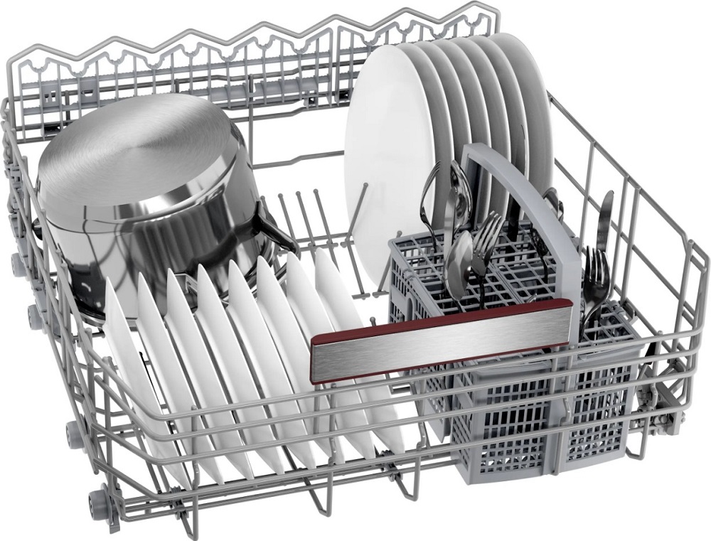 Корзина для столовых приборов — один из обязательных аксессуаров, которыми оснащается любая посудомоечная машина. Она представляет собой сетчатый пластиковый органайзер, в котором устанавливаются в вертикальном положении ложки, ножи и вилки. Корзина, как правило, разделяется на отдельные отсеки, в каждый из которых можно поместить один или несколько предметов. Зачастую сверху она закрывается специальной крышкой, которая также служит для разделения приборов, способствуя более тщательному их мытью.