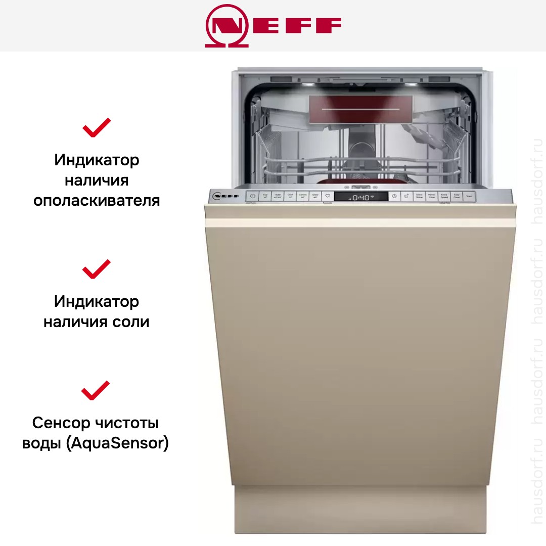 Техника оснащена инверторным мотором для тихой и долговечной работы, уровень шума всего 42 дБ делает работу практически незаметной. Подача горячей воды через проточный водонагреватель ускоряет стартовые этапы мытья. Для комфортного управления предусмотрен закрытый электронный панельный блок с TFT-дисплеем и кнопками, таймер задержки запуска от 1 до 24 часов, а также индикаторы соли и ополаскивателя. Поддержка Home Connect дает возможность запускать и контролировать программу дистанционно со смартфона.