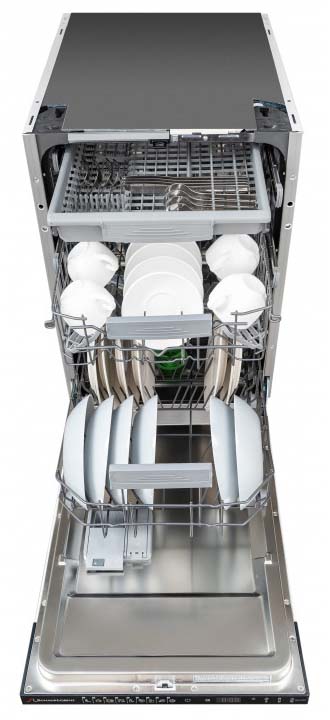 Полноразмерные модели выбирают в больших семьях, а также те, кто много готовит или часто принимает гостей. Их вместимость может составить до 15 комплектов посуды, а габаритные размеры соответствуют размерам стандартной кухонной мебели шириной и глубиной 60 см и высотой 82-85 см. Они выпускаются как во встраиваемом, так и в отдельностоящем варианте: во втором случае для установки понадобится достаточно много места. Как правило, полноразмерные приборы отличаются большим набором стандартных и специальных программ мойки, а также дополнительных опций: в частности, они оснащаются третьей корзиной для мытья столовых приборов.