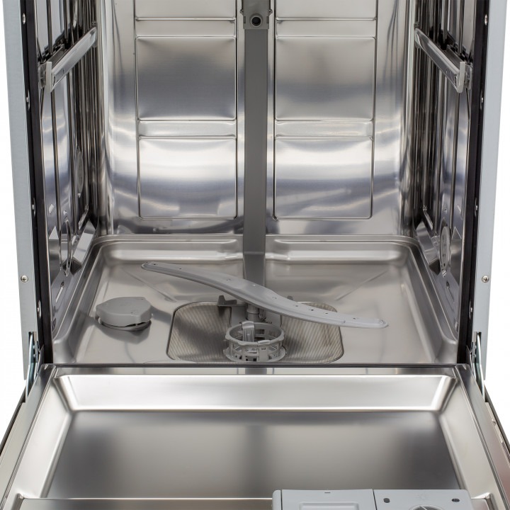 Полноразмерная посудомоечная машина встраивается под столешницу. Она вмещает до 12 стандартных комплектов посуды. При этом вы можете менять высоту верхней корзины, чтобы загрузить в нее кастрюли или сковороды. Индикаторы соли и ополаскивателя позволяют вовремя обновлять моющие средства.